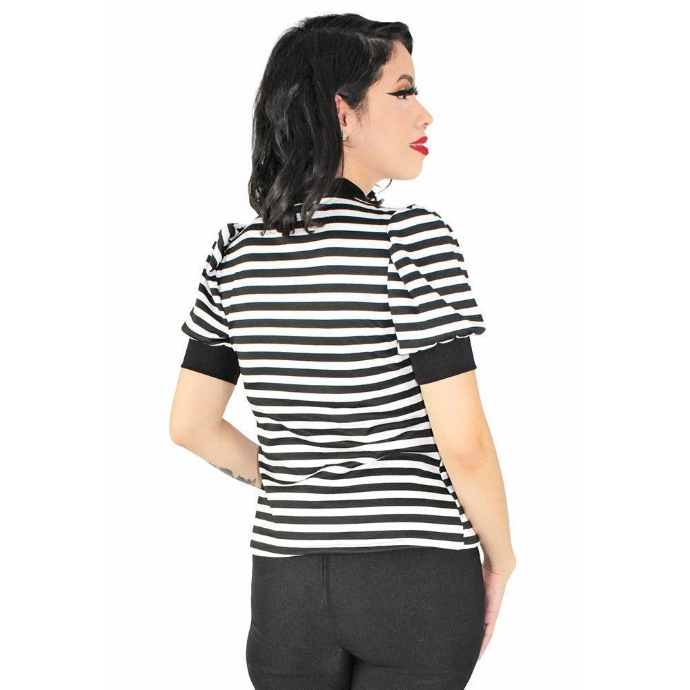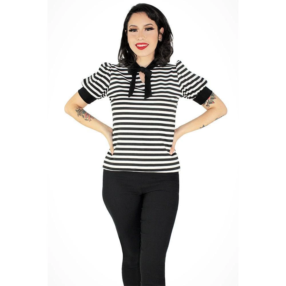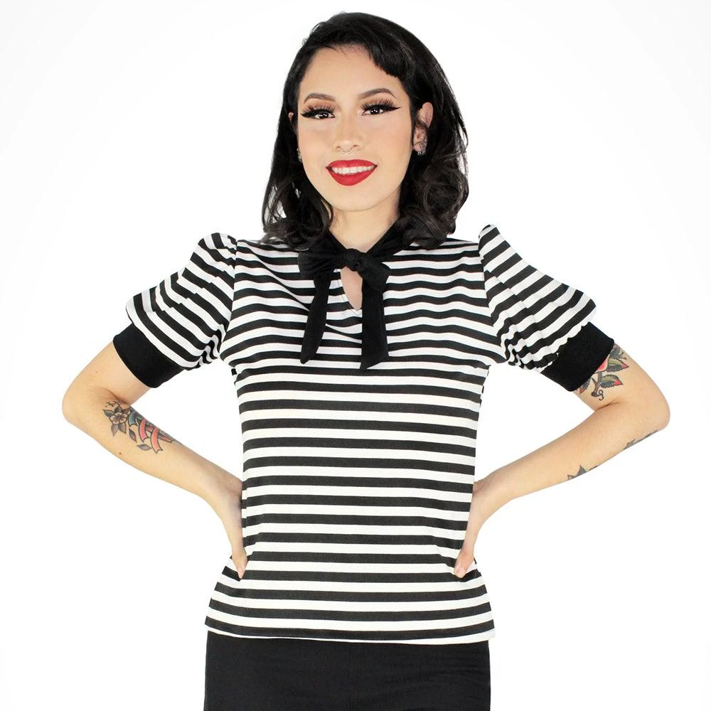 The adorable retro top features slightly puffed short sleeves with contrasting black bands, a lightweight material for comfort, and a flirty bow to tie at the collar. Made in the USAÂ