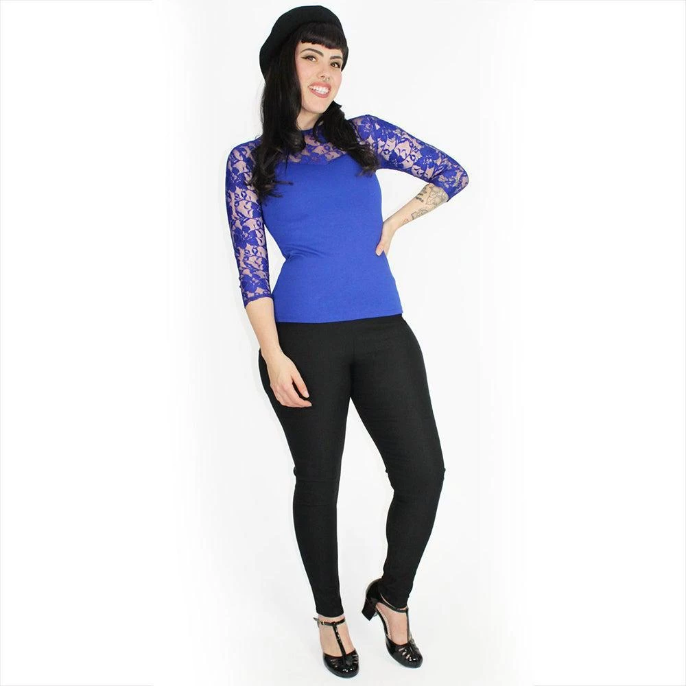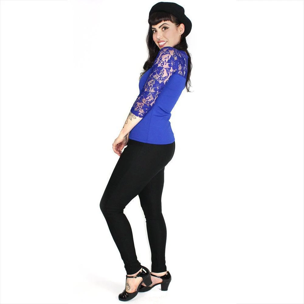 The lacey blue top from Hemet features lace around the shoulders and arms, a round neckline, thick material at the bottom, a sweetheart cut at the front, a flattering keyhole at the back, three quarter sleeves, and an overall romantic look. Perfect with circle skirts for special occasions or every day wear.