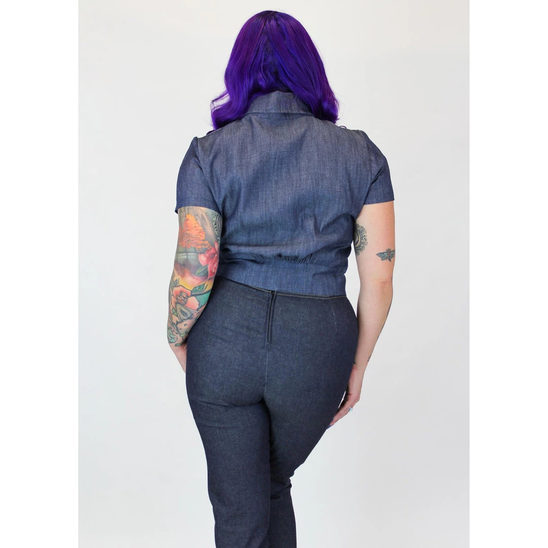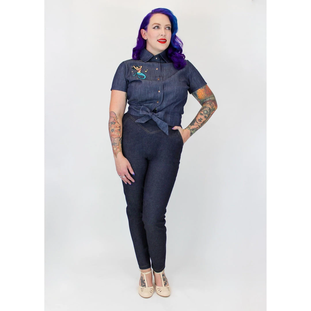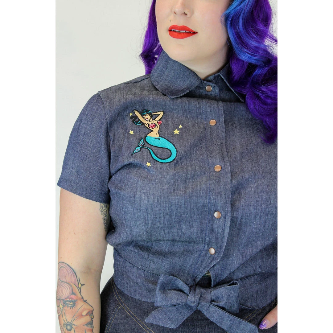 This fabulous knotted-waist blouse from Hemet is the perfect topper for your high waist capris and retro circle skirts. The denim top has a gorgeous mermaid embroidered on the right chest, and it features a fold-over collar, short sleeves, and straps to tie into a bow at the front. The snap-up closure makes it easy to dress and easy to style by snapping all snaps or leaving one or two open. Â