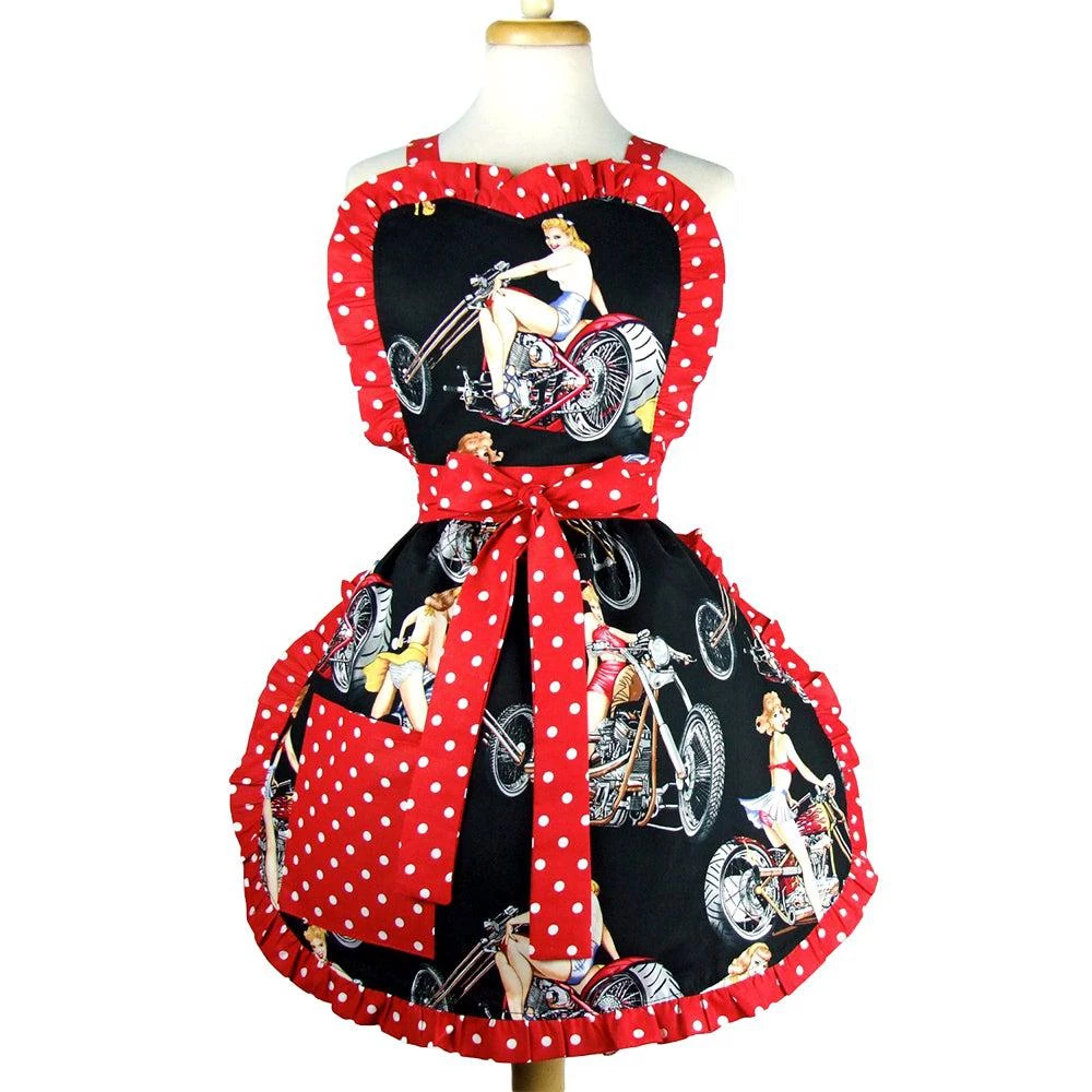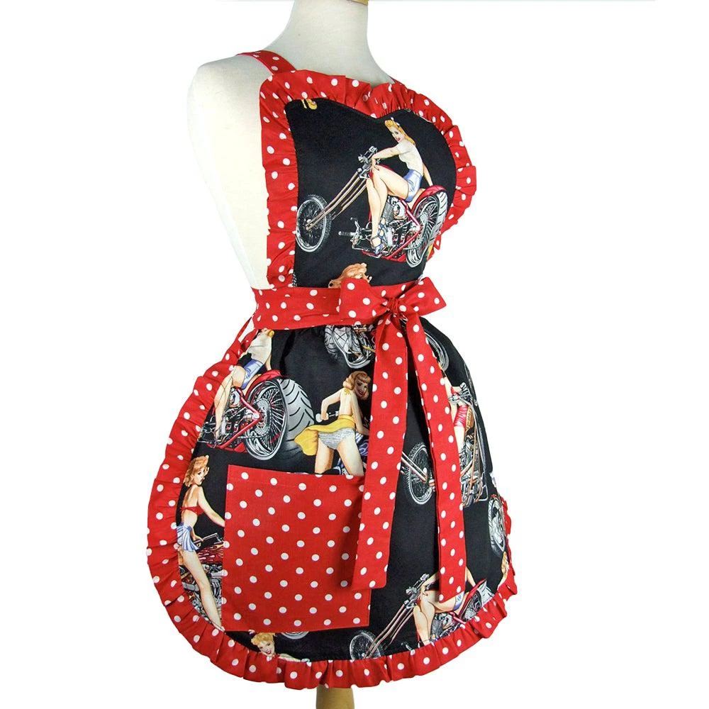This unique apron features stunning pinups on vintage motorcycles on a black background, framed with a fresh red & white ruffled trim. Lengthy straps around the neck and waist make this apron amazingly adjustable. Tie at the back or wrap around to the front to make a sweet bow.