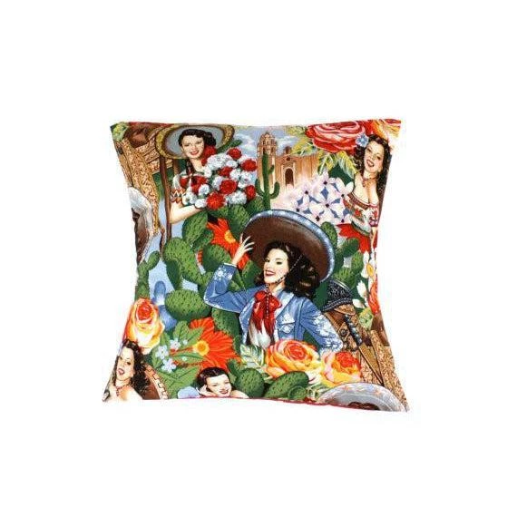 This lovely envelope-style cotton pillow cover from Hemet features a fun print with Mexican Senoritas over a spectacular background composed of cacti, Missions Churches and flowers.The rear of the pillow has a cheery red and white polka dot pattern. A fun way to give your pillows an update!