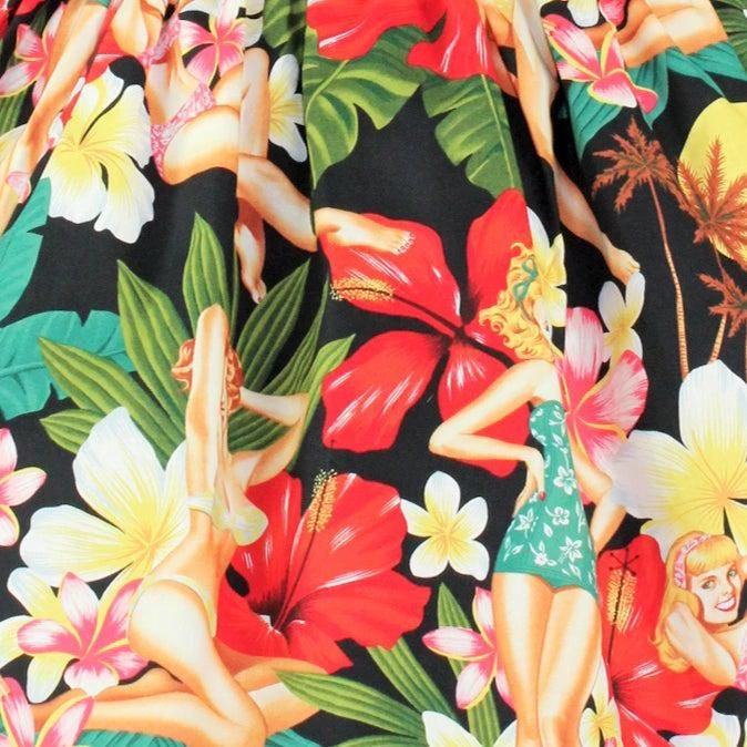 This beautiful multi-color Hawaii inspired elastic skirt is suitable for tropical getaways, tiki bar outings, and luau pool parties! It features a bold tropical floral print, complemented by vintage bathing beauties, on a black background. The material is airy and breathable, perfect to layer over a short petticoat, and the wide elastic waistband has incredible stretch for a very accommodating fit. Made in the USA!
