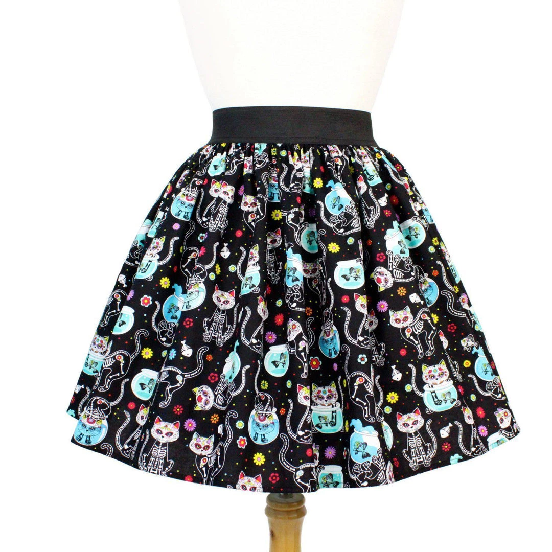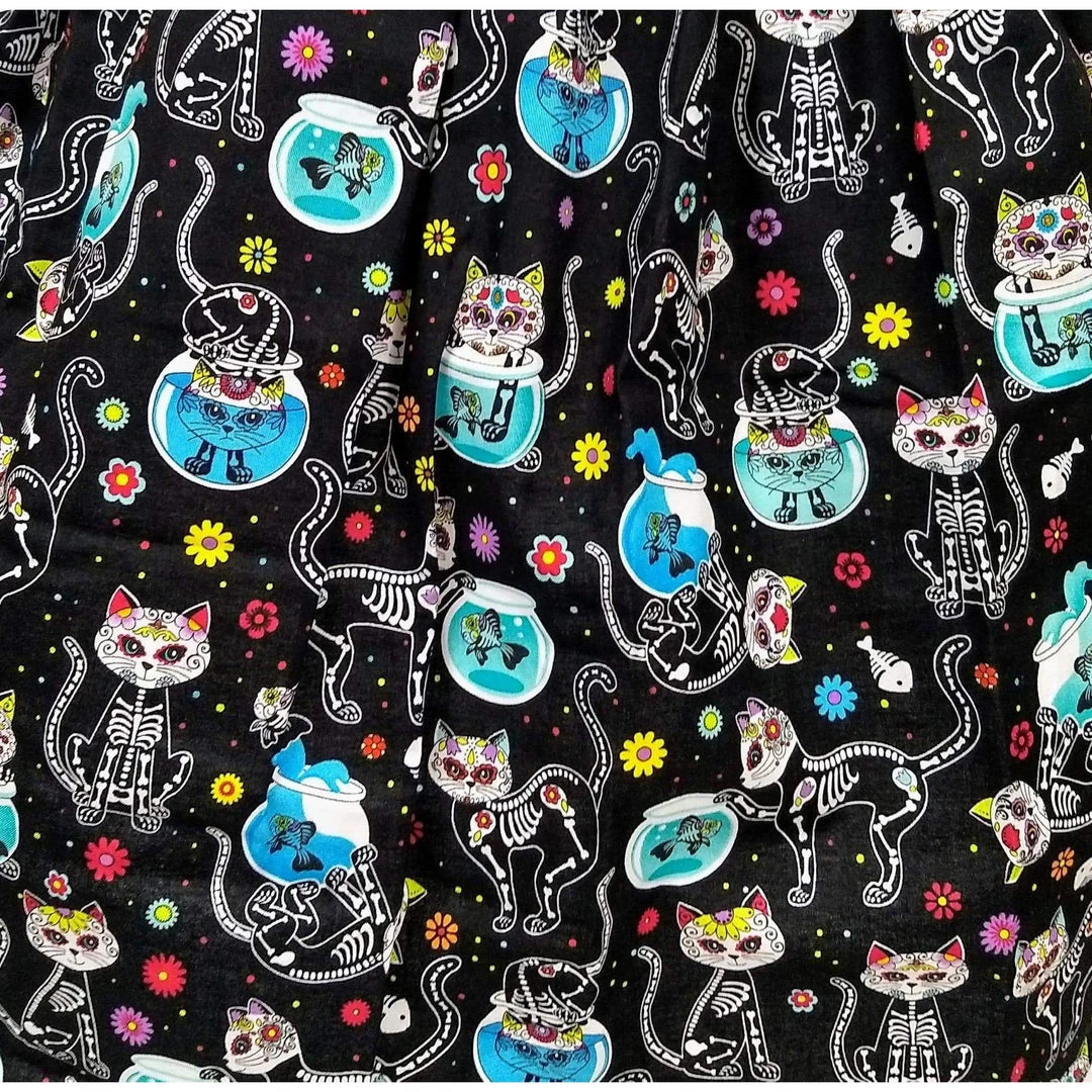 Kitties, fishies, fish bowls, flowers… this skirt has it all! It is a truly an electric and fun pleated skirt. The black background enhances the whites, pinks, purples, reds, and blues on the Day of the Dead kitty cats and bowls. The skirt features a black elastic waist band and pleats all around. The wide elastic waistband has incredible stretch for a very accommodating fit. Made in the USA!