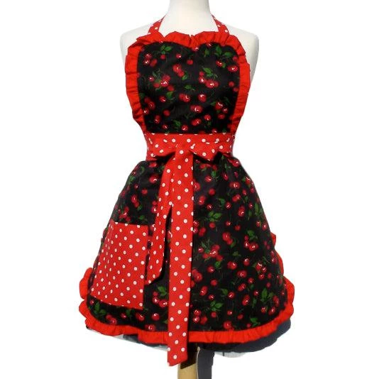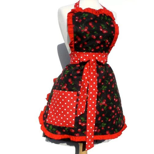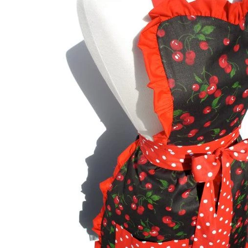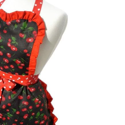 This super cute apron would make a perfect a gift for someone who loves to look fabulous while cooking – or for yourself, we won’t tell! Featuring a fun cherry print on a black background with a white polka dot trim! Perfect for baking parties & pinup photo shoots. Lengthy straps around the neck and waist make this apron amazingly adjustable. Tie at the back or wrap around to the front to make a sweet bow.