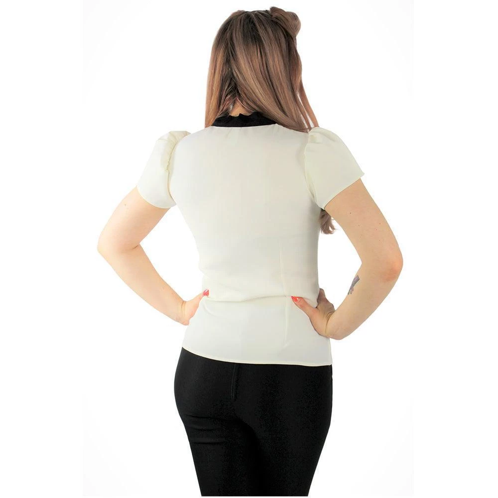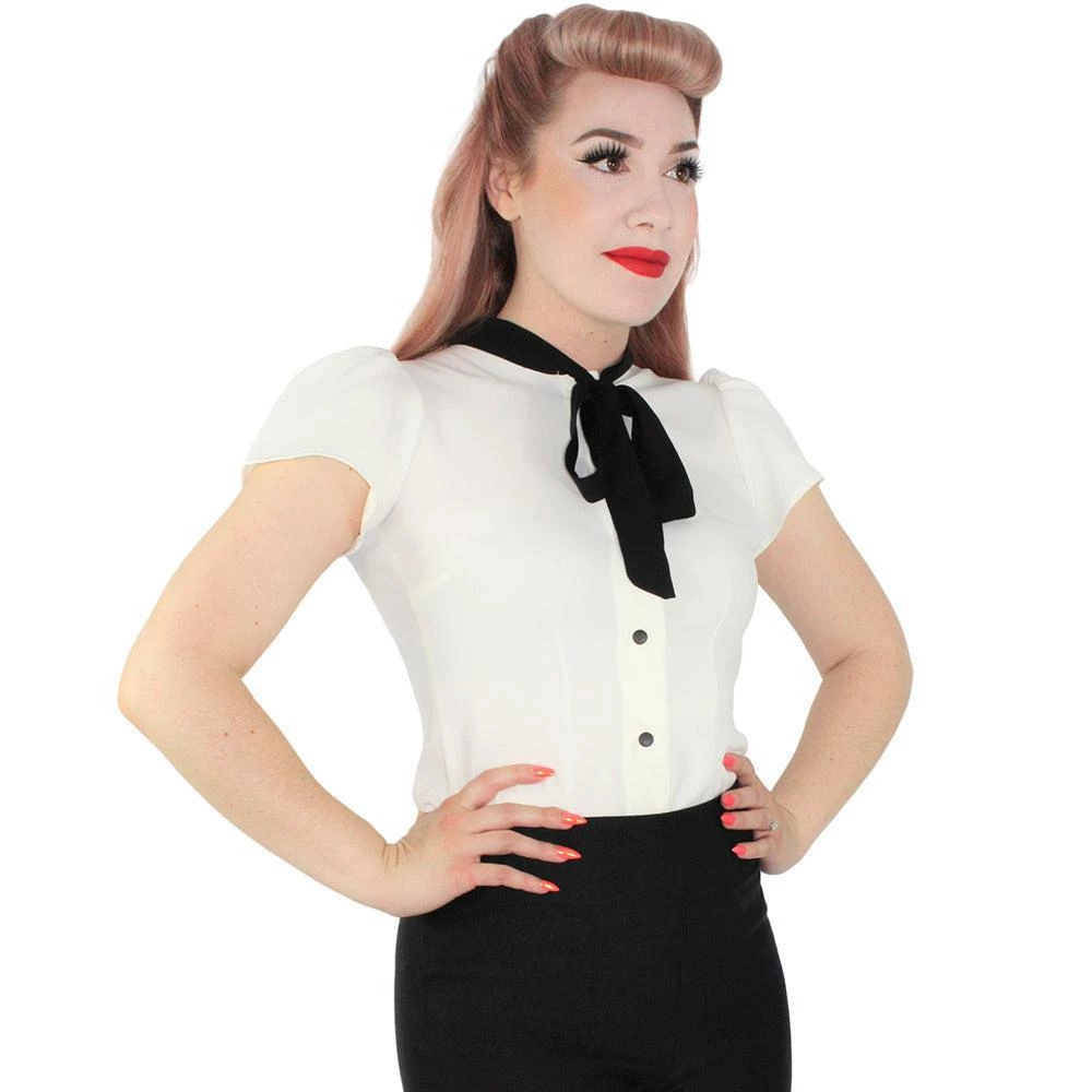 The adorable retro top features short flowy sleeves, snap front, and a flirty black bow to tie at the collar, all in a light and airy fabric. Perfect for day or night! Made in the USAÂ