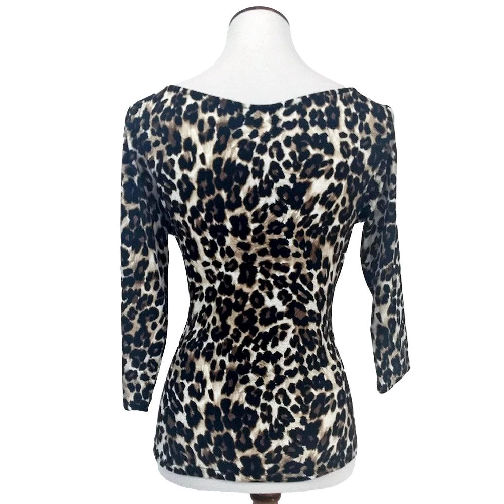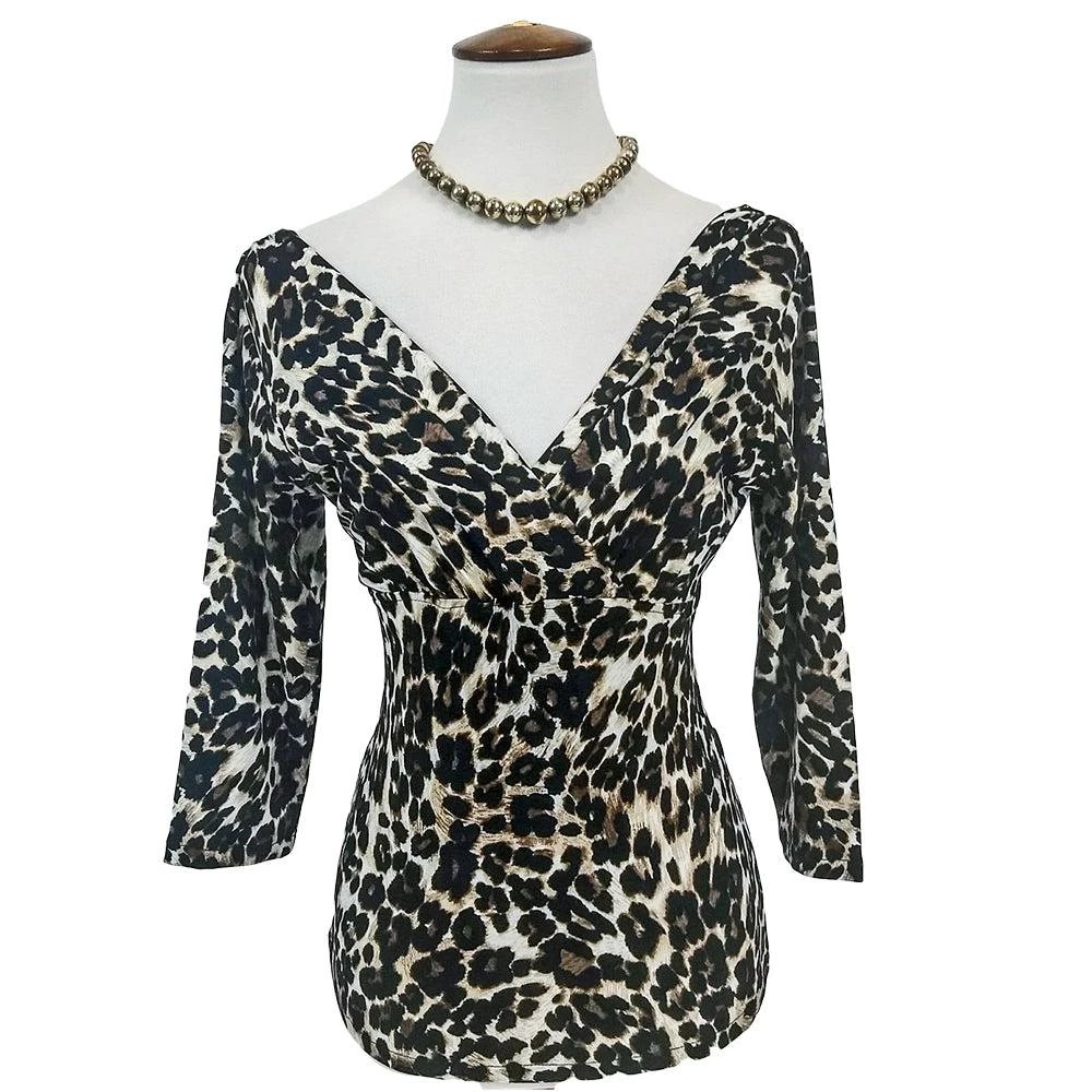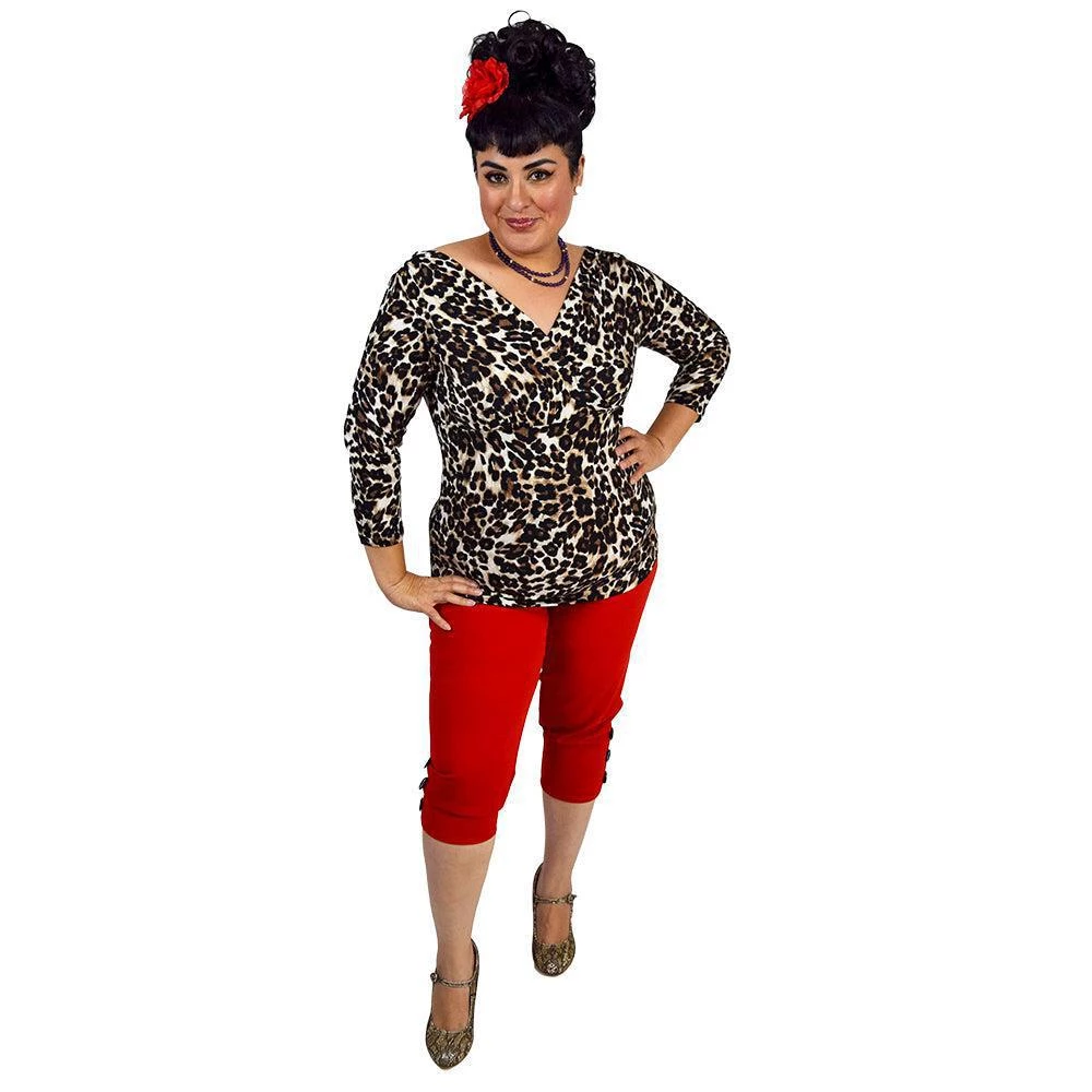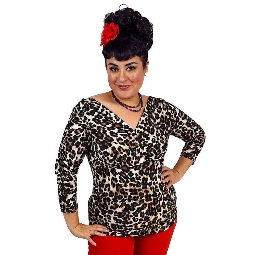 This stunning ’50s-inspired overlap top in leopard print is a comfortable and versatile staple for any pinup or rockabilly wardrobe! It features a wide v-neckline at the front, a round collar line at the back, three quarter sleeves, and an overlap of fabric at the bust. The material is lightweight, soft, and stretchy for extra comfort. Made in the USAÂ