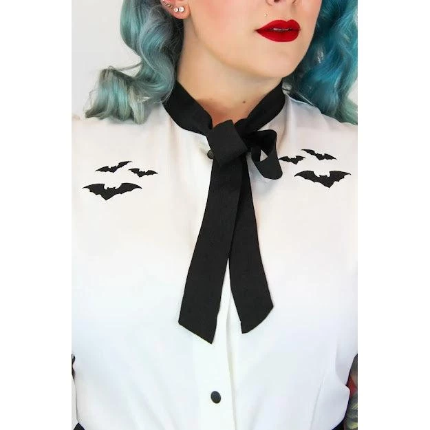 Go completely batty in this flirty top from Hemet! It features short flowy sleeves, a snap up closure at the front, and a cute flirty collar bow. The light-weight material is off white and has bats embroidered in black across the bodice. This is a fresh, airy, and cute blouse perfect for hot spring and summer days, and just right for wingin’ it at night.