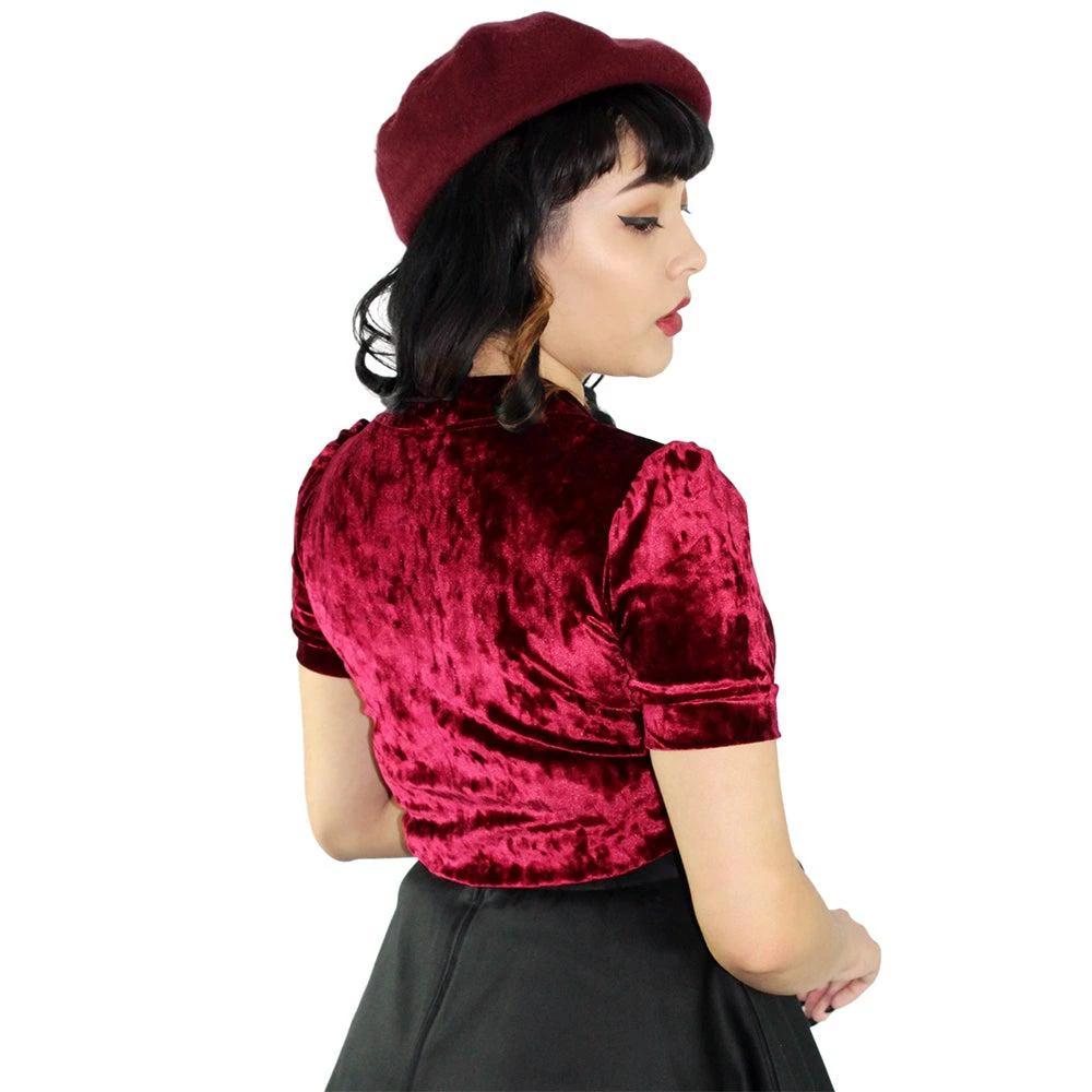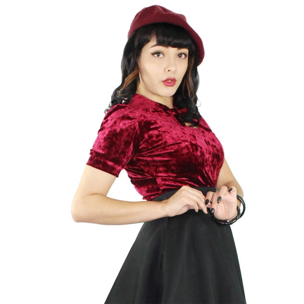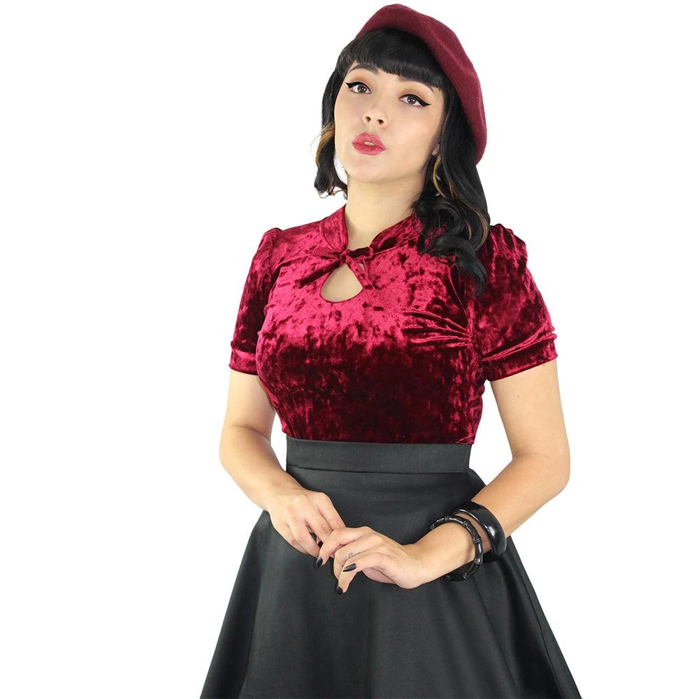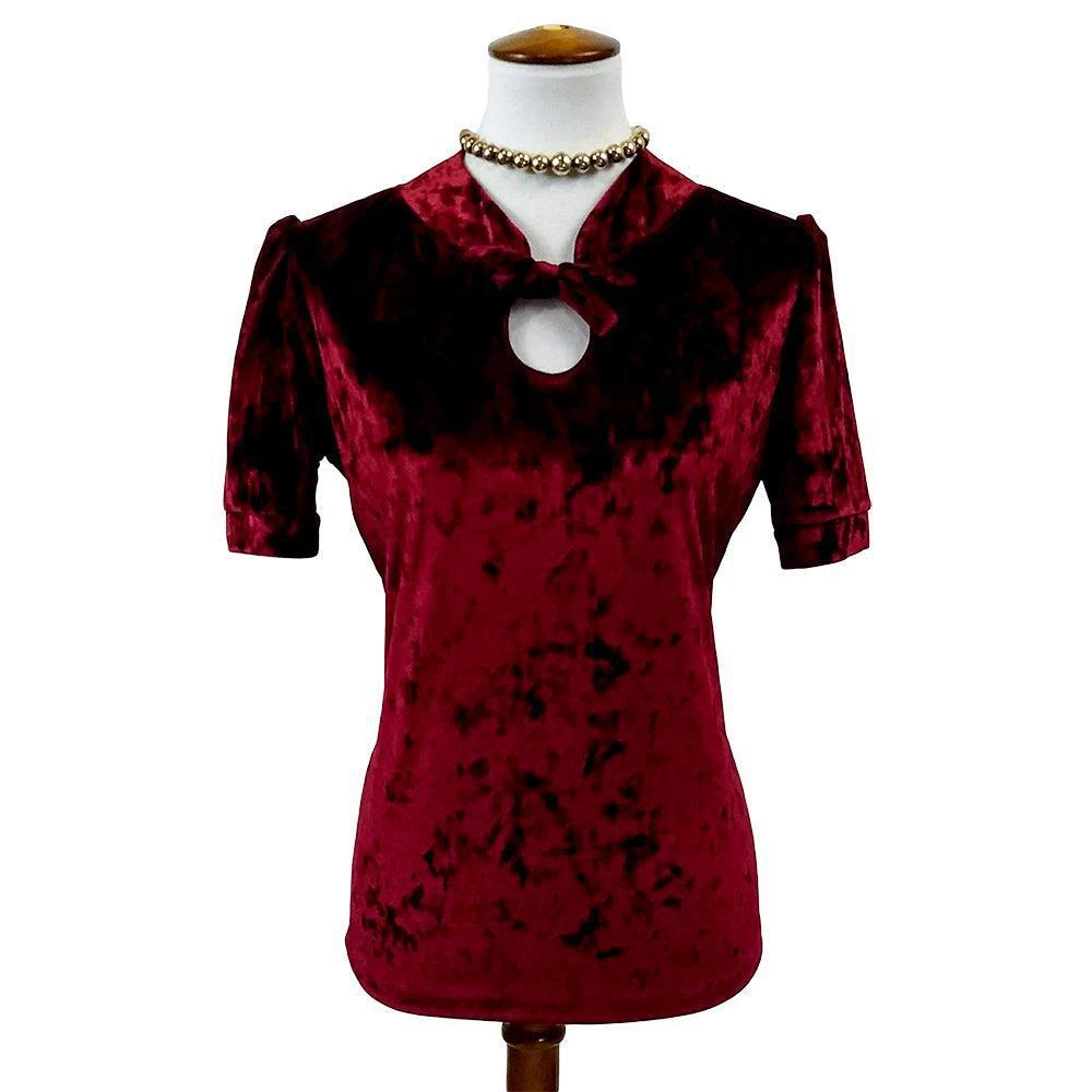 Feel like a 1940s velvet queen in this soft & stretchy top from Hemet. It features a knotted peekaboo keyhole at the front, short sleeves, and a stunning dark red color to catch eyes all evening long. Made in the USA.