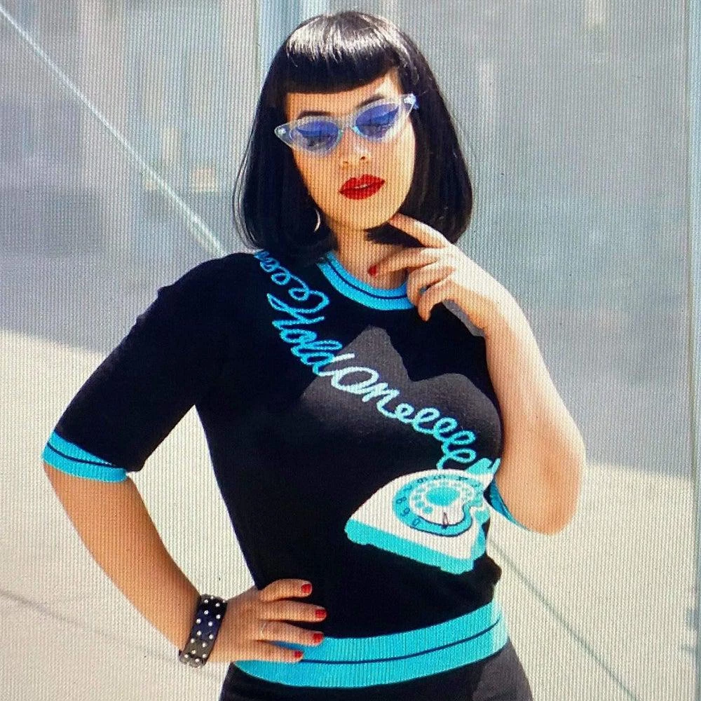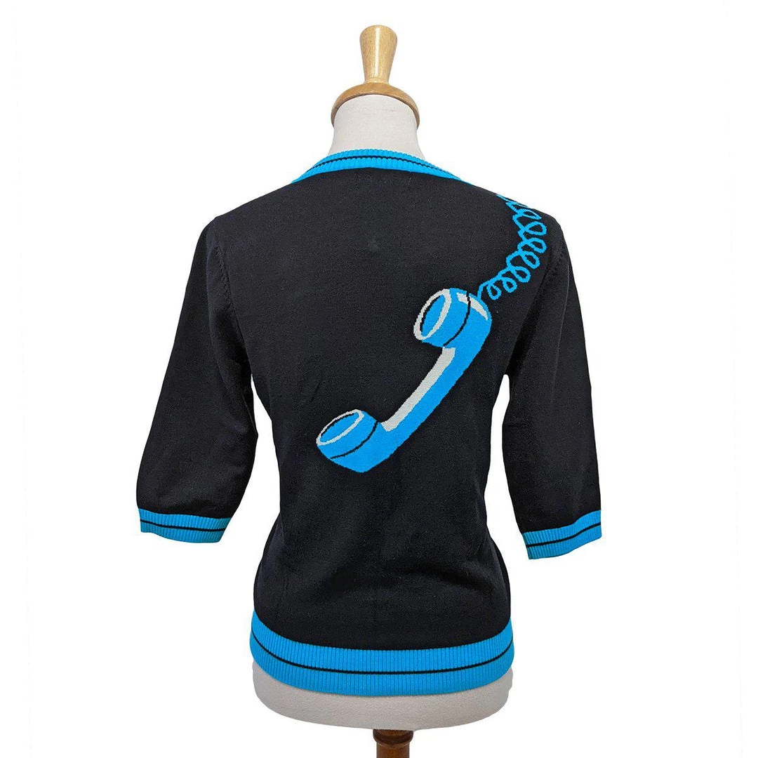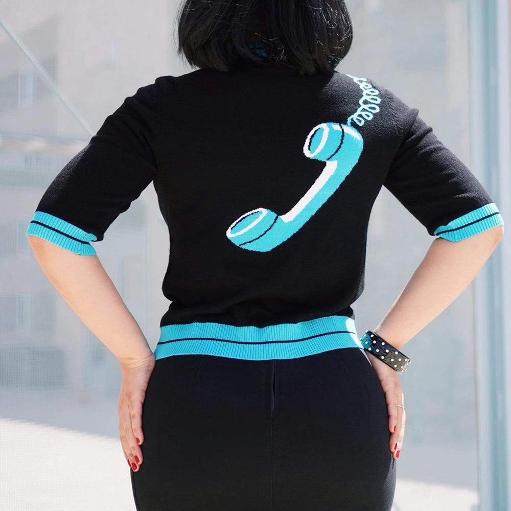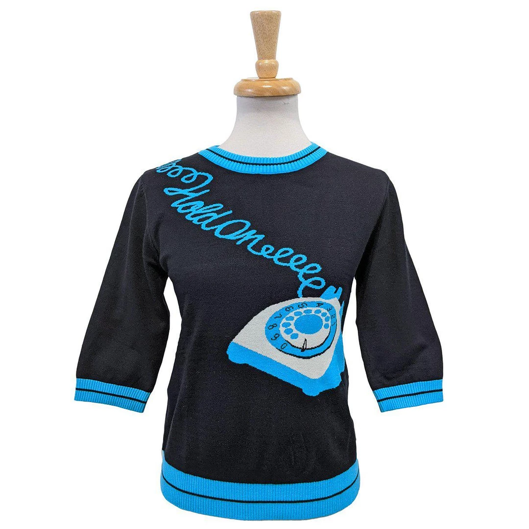This soft and stretchy retro sweater from Kissing Charlie is sumptuously sexy and fun. It was inspired by a completely retro view of what “hold” meant: the designer’s mother, when she needed to attend to another task, would throw the phone over her shoulder, say “hold on” and get on with it! This fabulous original design has a rotary-dial phone base on the front, a curling cord that winds across the shoulder and down the back where the receiver dangles. Blue details on a black background, it has ribbing at the neck, at the elbow-length sleeves, and at the bottom, which lands at the hip.