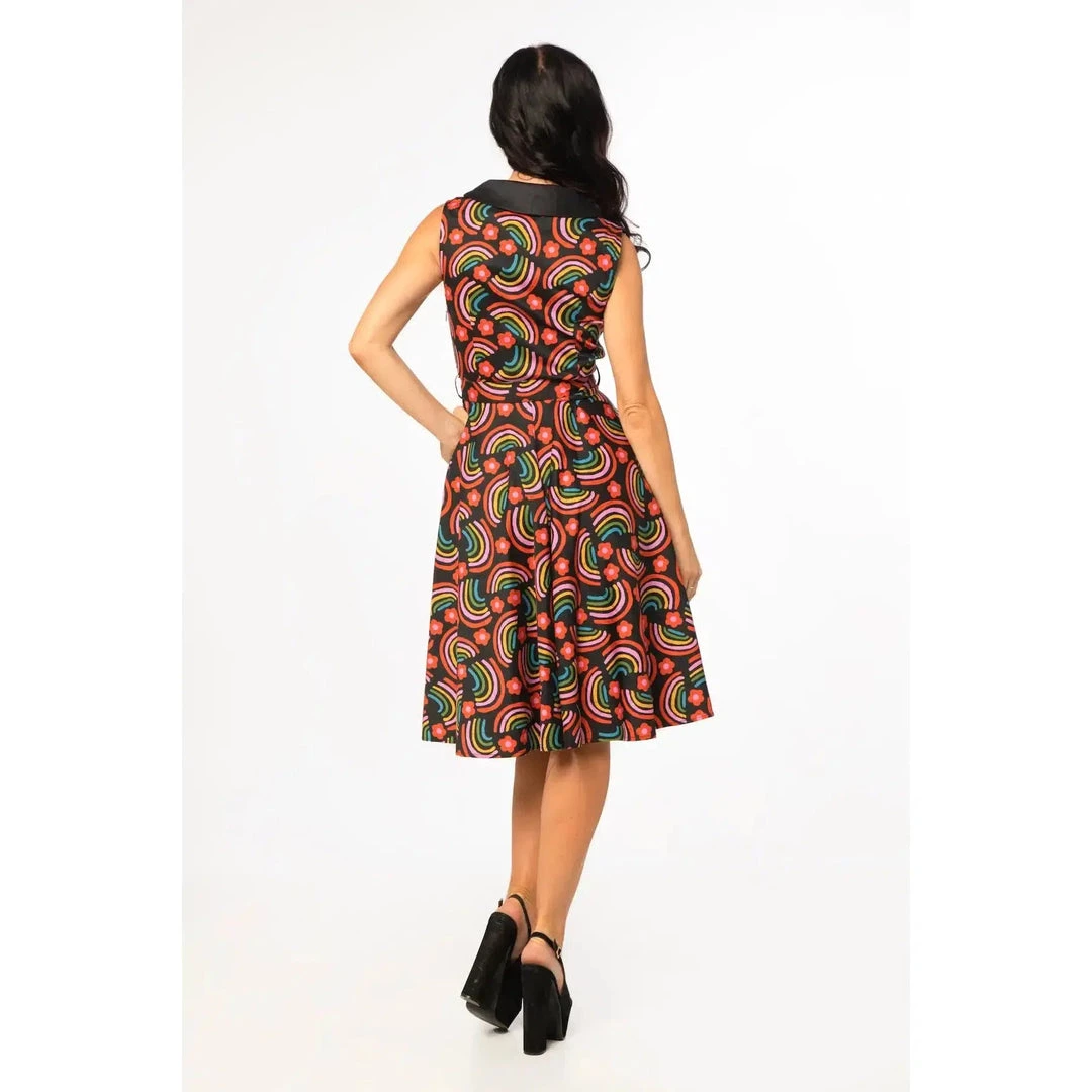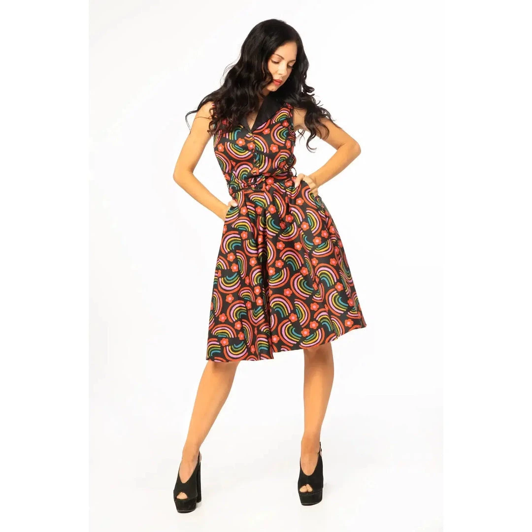 You’ll feel over the rainbow in this gorgeous swing dress from Miss Lulo!  This sleeveless A-line dress is so easy and fun to wear. It has a retro shirtwaist design with a v-neckline accented with a black lapel collar. Front cloth covered buttons, a removable belt, side seam pockets and a hidden zipper complete the look.