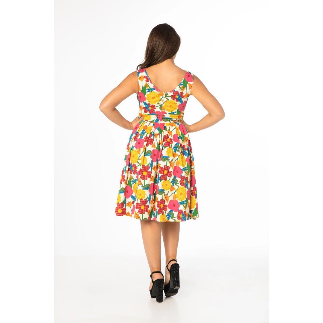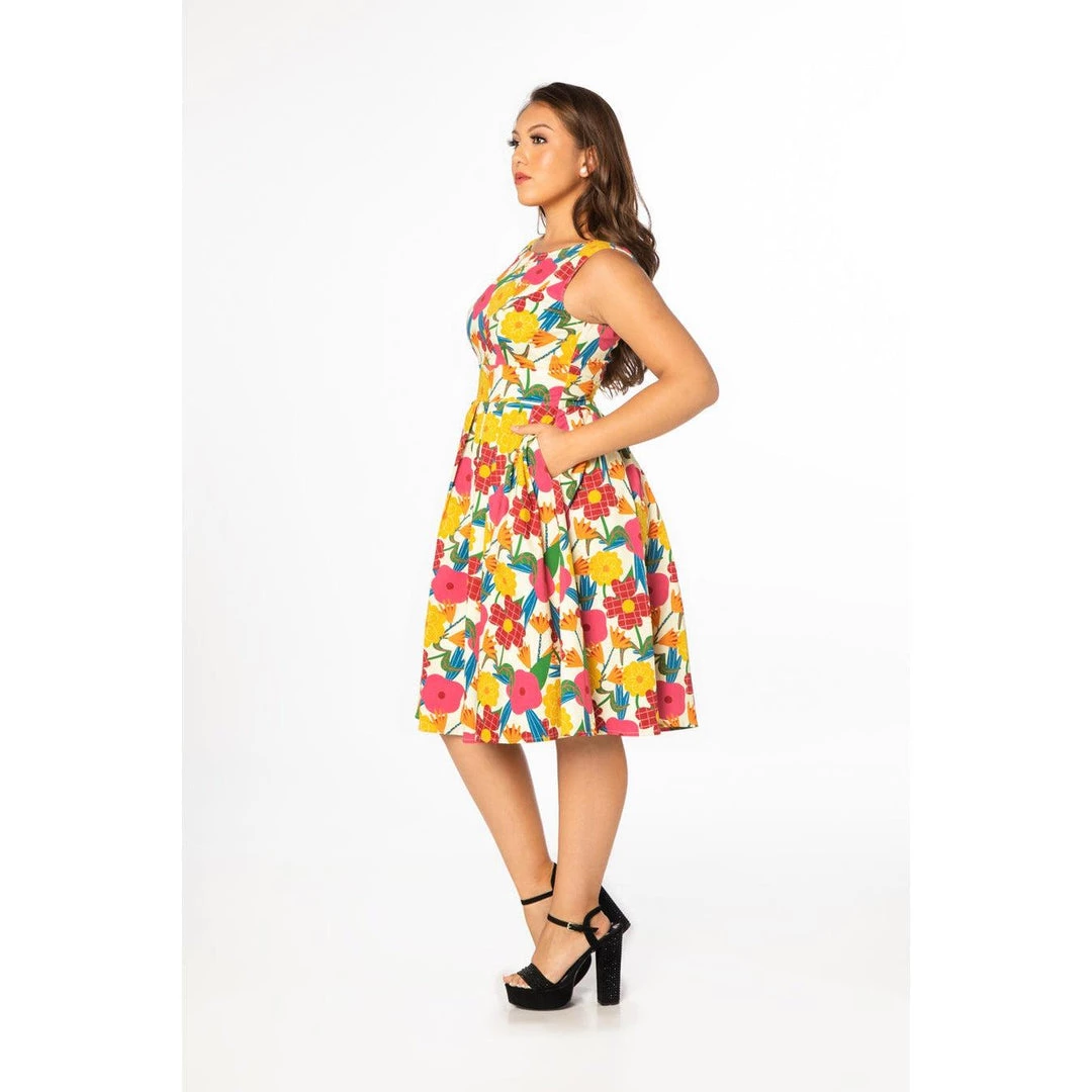 This floral print swing dress from Miss Lulo is so retro! Made from a wonderful original print fabric with 60’s style flowers in bright, bold colors, the sleeveless A-line dress is so fun to wear. It has a gorgeous bodice with a boatneck in front and it dips in a v in the back. There’s a banded waist above the box-pleated swing skirt, side seam pockets, and a hidden back zipper. Â