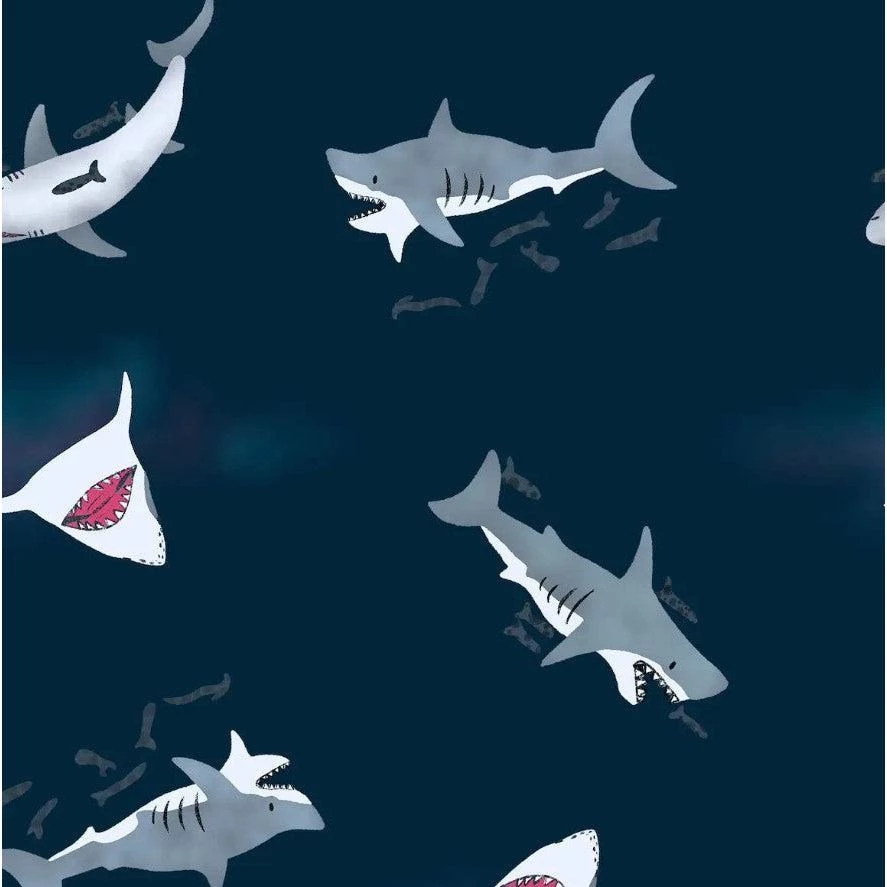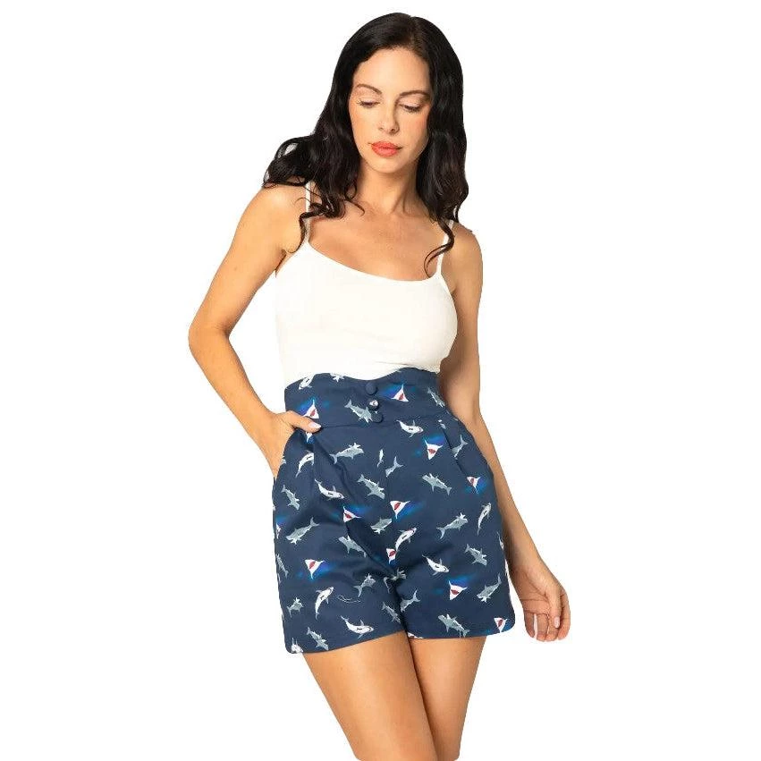 Miss Lulo’s Reese shorts are so retro, so cute, and so fun!! Made from an original artwork print of sharks swimming on a dark blue background, these high-waisted shorts feature a smocked back elastic waist, front pockets, and a pretty front dip accentuated with three decorative buttons. Closes with a hidden zipper on the left.