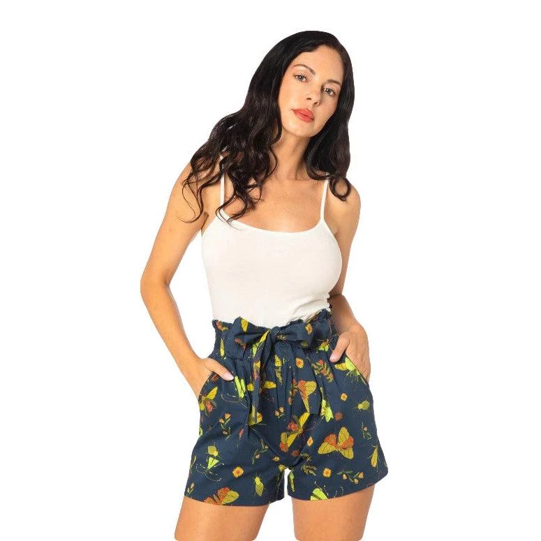 The Sage shorts from Miss Lulo are as lovely as a summer night!  Made from an original artwork print of pretty butterflies, outlandish bugs, and delicate flowers on a dark blue background, these high-waisted shorts feature an elasticized waist with a removable sash and front pockets.Â