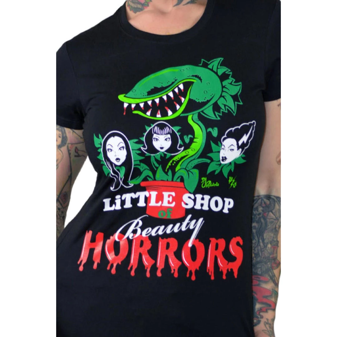 Love those beautiful lady-monsters in this fabulous tee from Pinky Star! This basic black tee has short sleeves and a round neck. Morticia, Ronette, and the Bride of Frankenstein grow from a blood-red pot holding a green Audrey II, and “Little Shop of Beauty Horrors” is splashed across the front in monster-movie font. Too much fun!!!