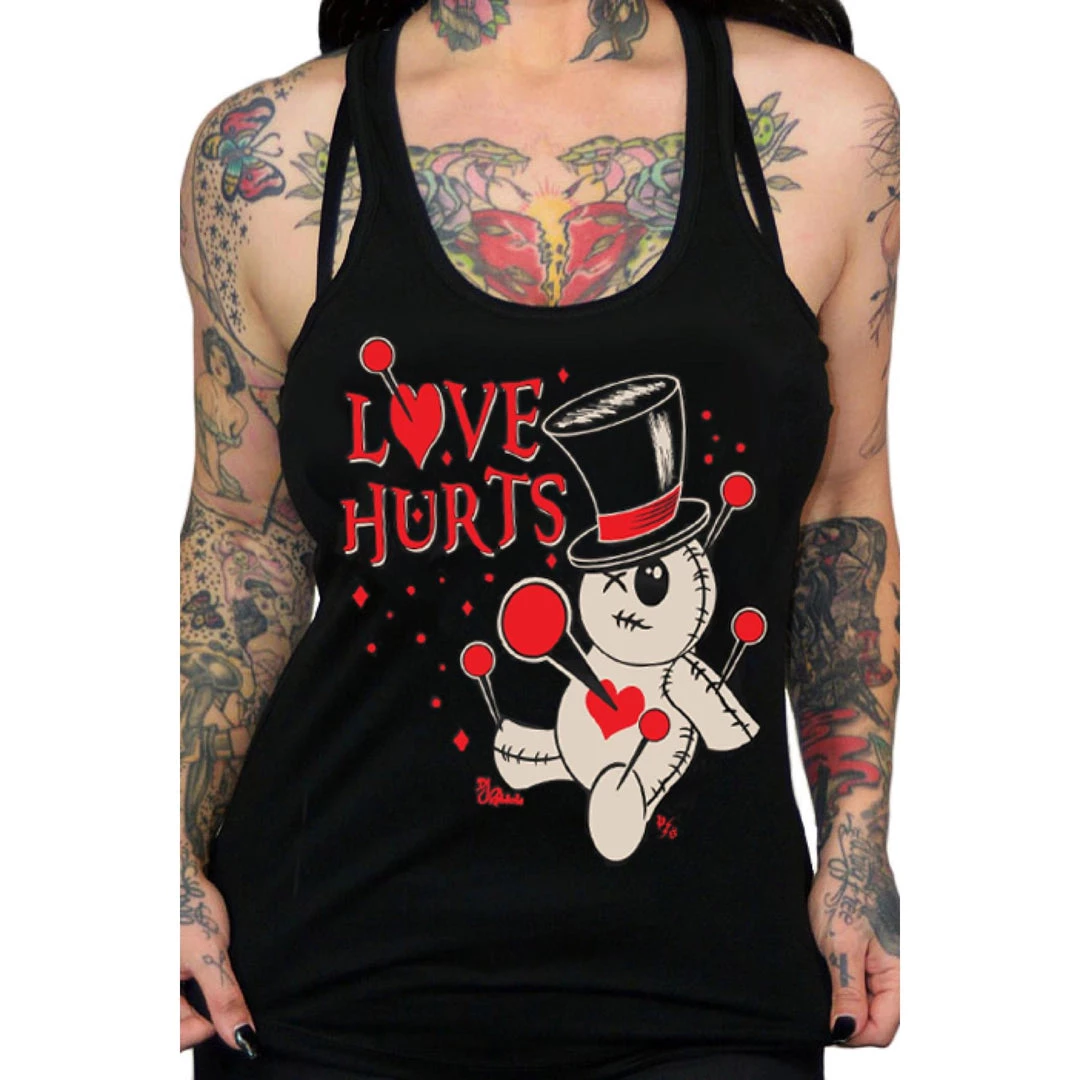 This racer-back tank from Pinky Star pinpoints the problem! The cool and comfy cotton tank features a top-hatted voodoo doll pinned in the heart and the words “Love Hurts” in blood red. Perfect for working out, going to a concert, or any casual day out!
