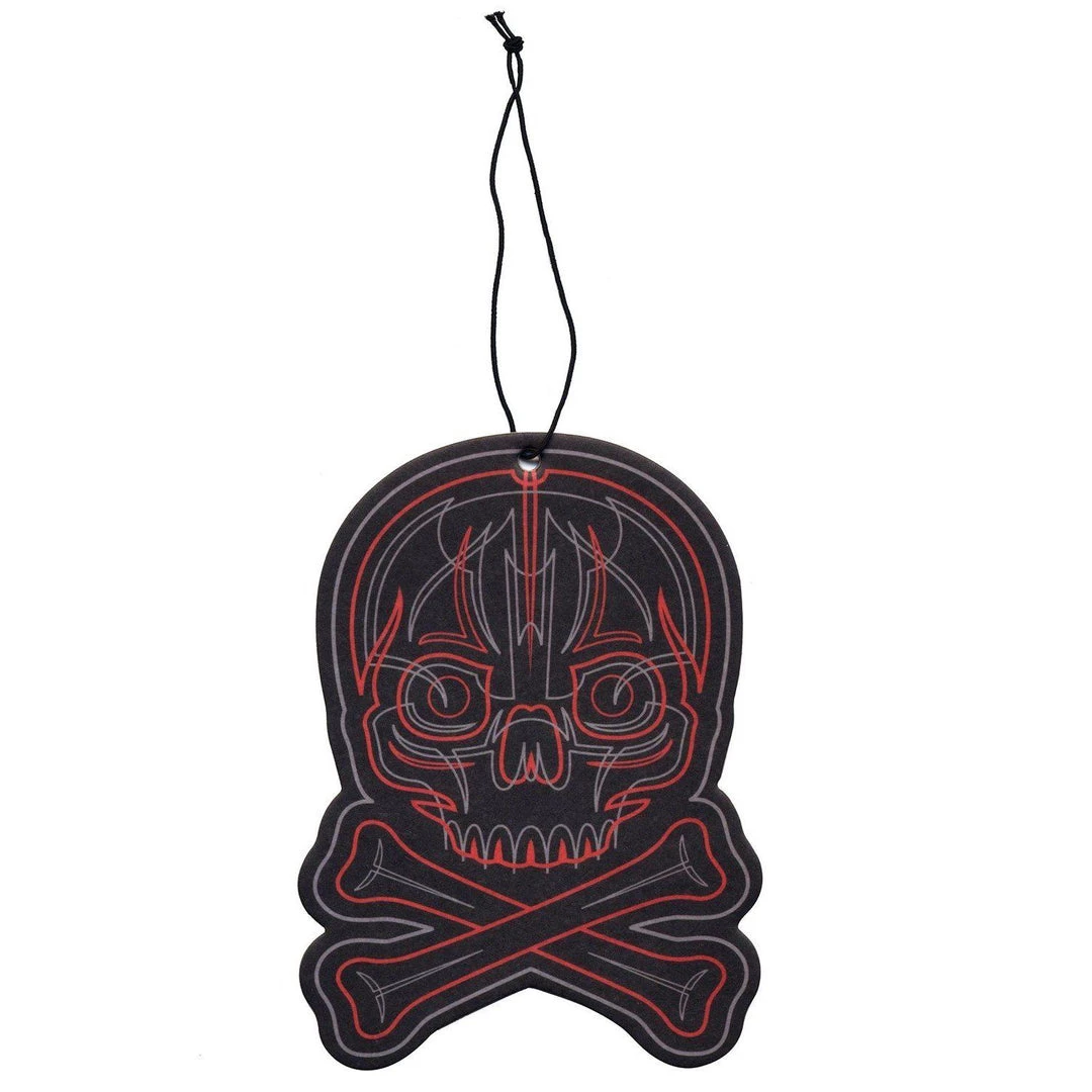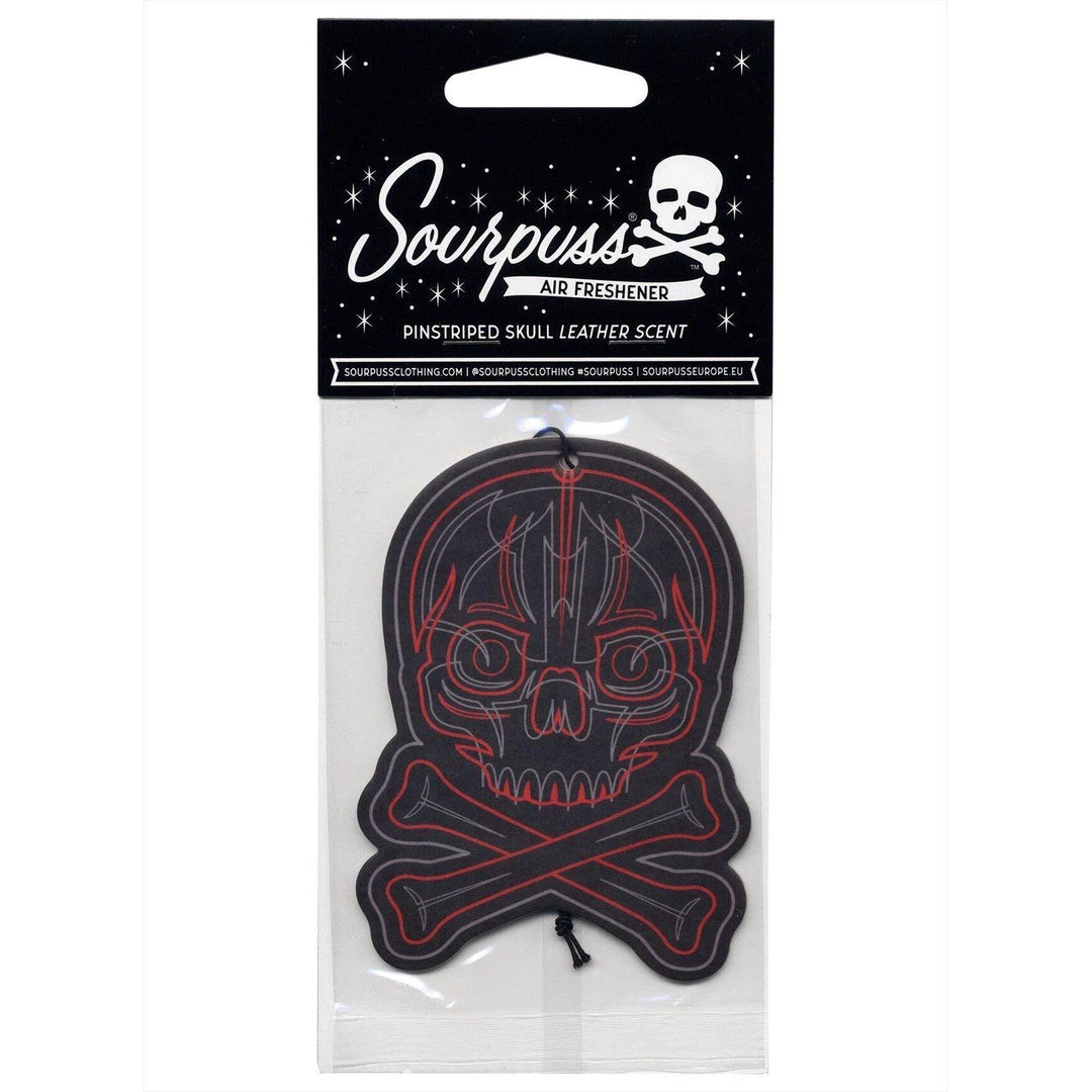 The Sourpuss Pinstriped Skull air freshener evokes that luxurious smell of new leather as it hangs in your car or home. It’s an image of a perfectly pinstriped skull and crossbones in red and gray on a black background. As always, lots of freaky fun from Sourpuss!