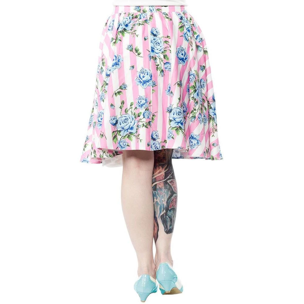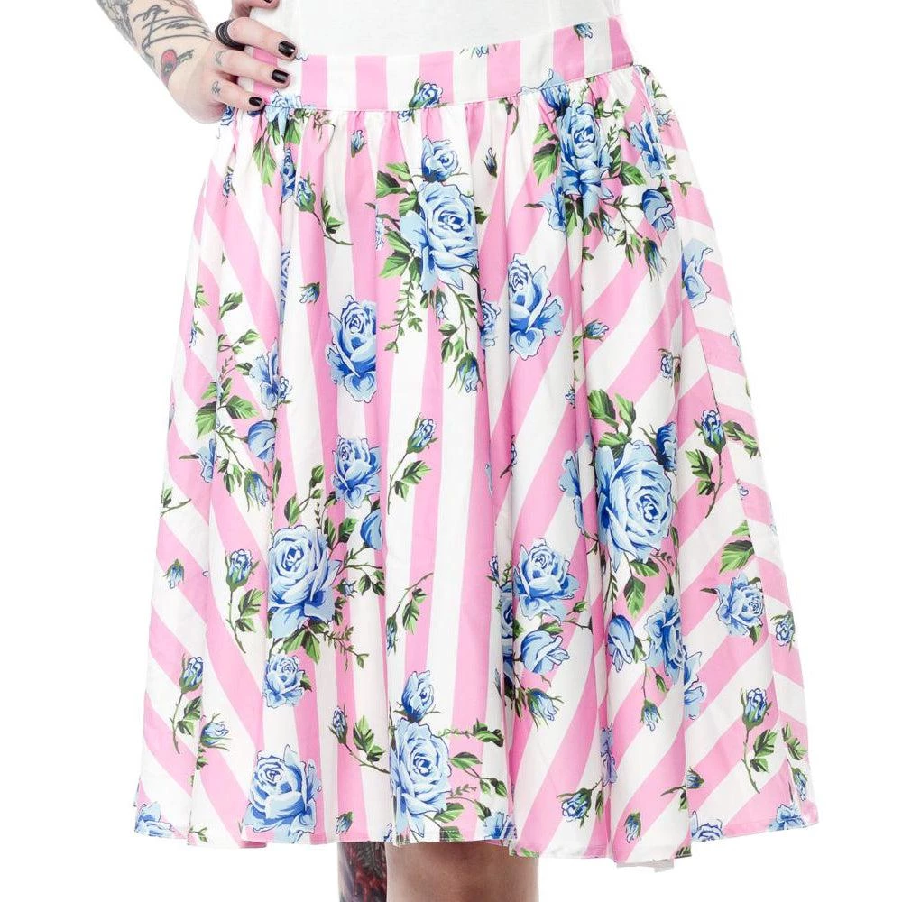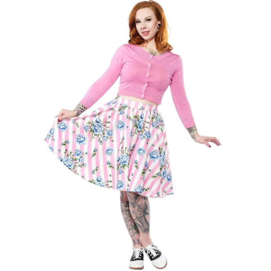 The Carousel Roses Sweets skirt, featuring a print from the amazingly talented work of Lekit Im, is a dance floor must–perfect for twirling! The vintage-inspired fabric features delicate blue roses set over a baby pink stripe. The gorgeously full skirt is gathered onto a 1-1/2″ waistband, is fully lined, and has side seam pockets and an invisible zip closure