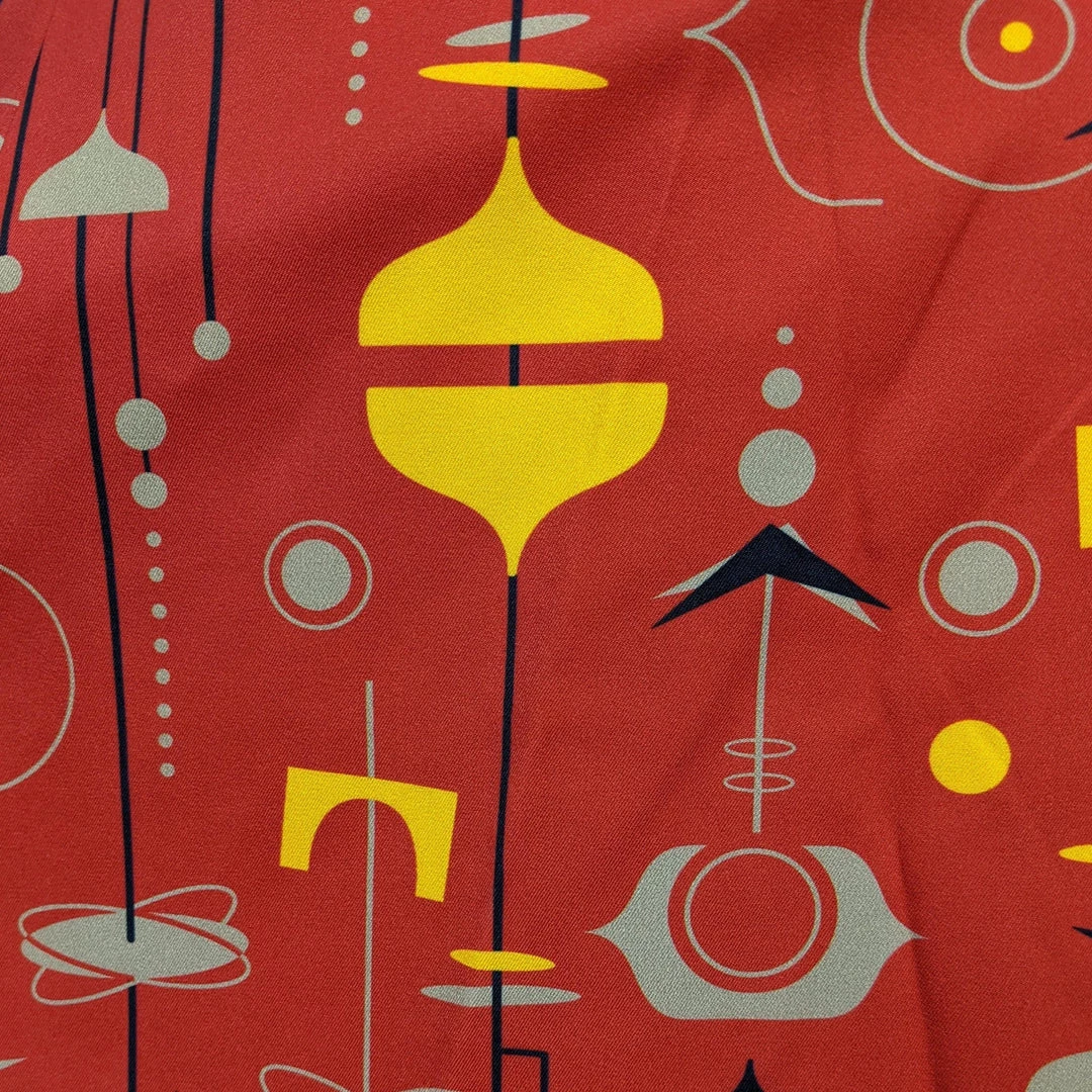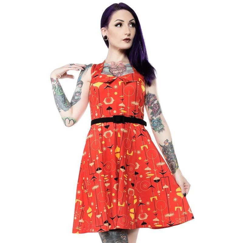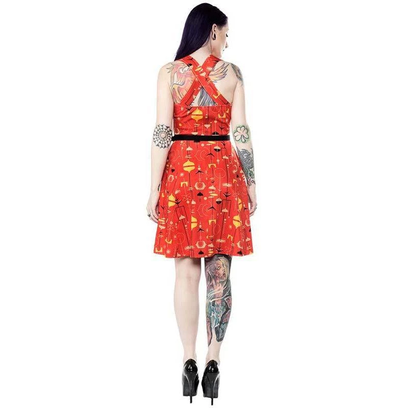Gorgeous strappy fiesta dress features a sweetheart neckline with fold-over bustline, wide straps crossed in back, elasticized back bodice, side zipper, and side seam pockets. The fun futuristic patterns in taupe, yellow, and orange give an atomic attraction to the gorgeous dress with a full skirt and a black belt for contrast. Hot cha!