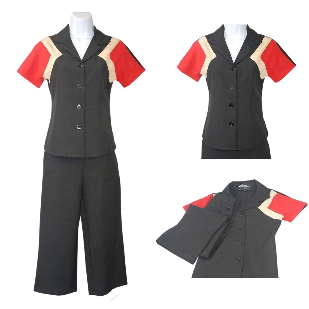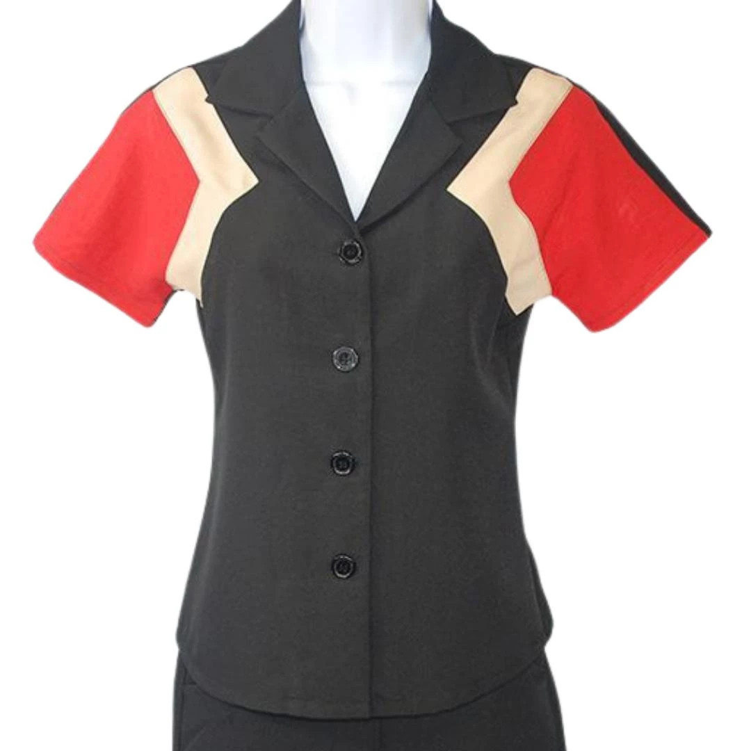 The Tri-Tone Short Sleeve Work Blouse from Star Struck is the ultimate in mid-century attire! Featuring short sleeves, a fold-over collar, and a button-up front, this blouse is gorgeously designed in black, red, and tan. Check out Star Struck’s fabulous wide leg capris, designed as a perfect companion piece for this blouse.  The sportswear styling works beautifully with high-waisted jeans, as well. Add a rockabilly tie-on headscarf to create a fabulous vintage-inspired outfit!
