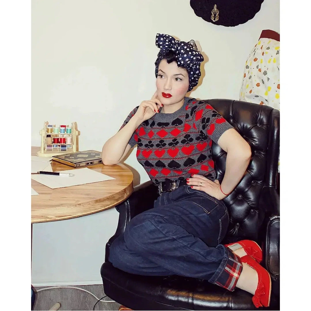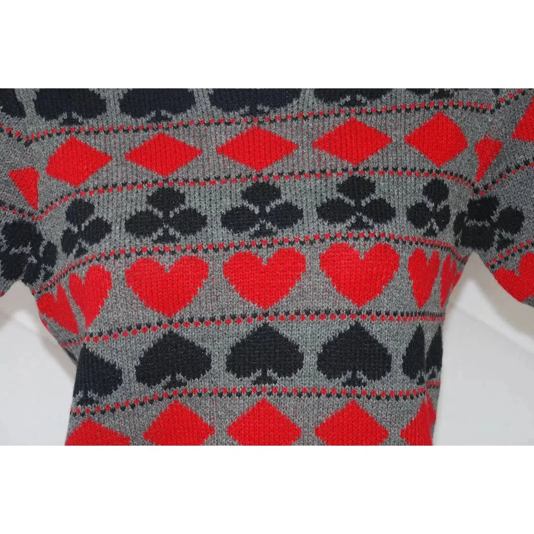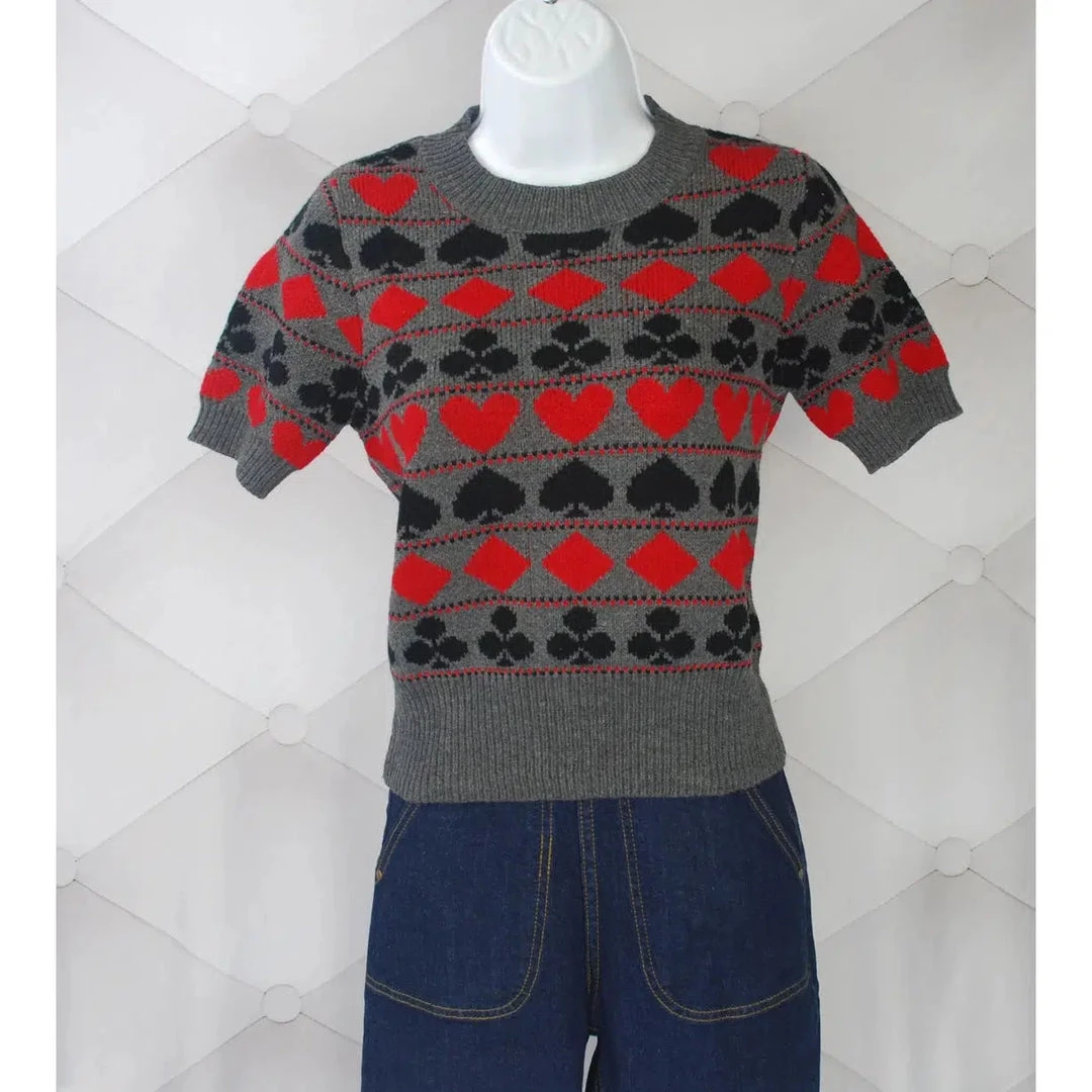 Let’s go to Vegas! An authentic reproduction of a 1940s Playing Cards short sleeve sweater with the same fun pattern front and back with black and red suits on a grey background.