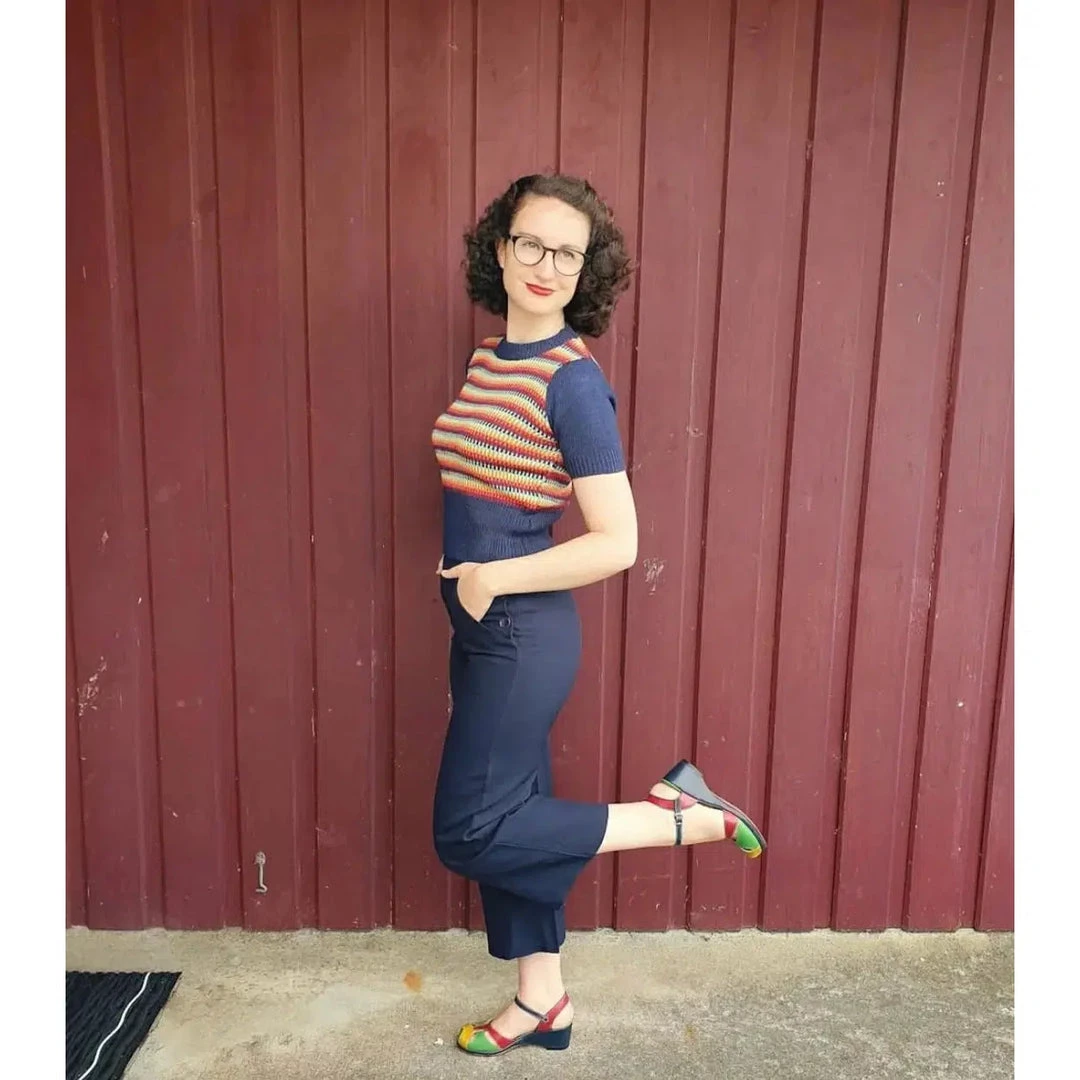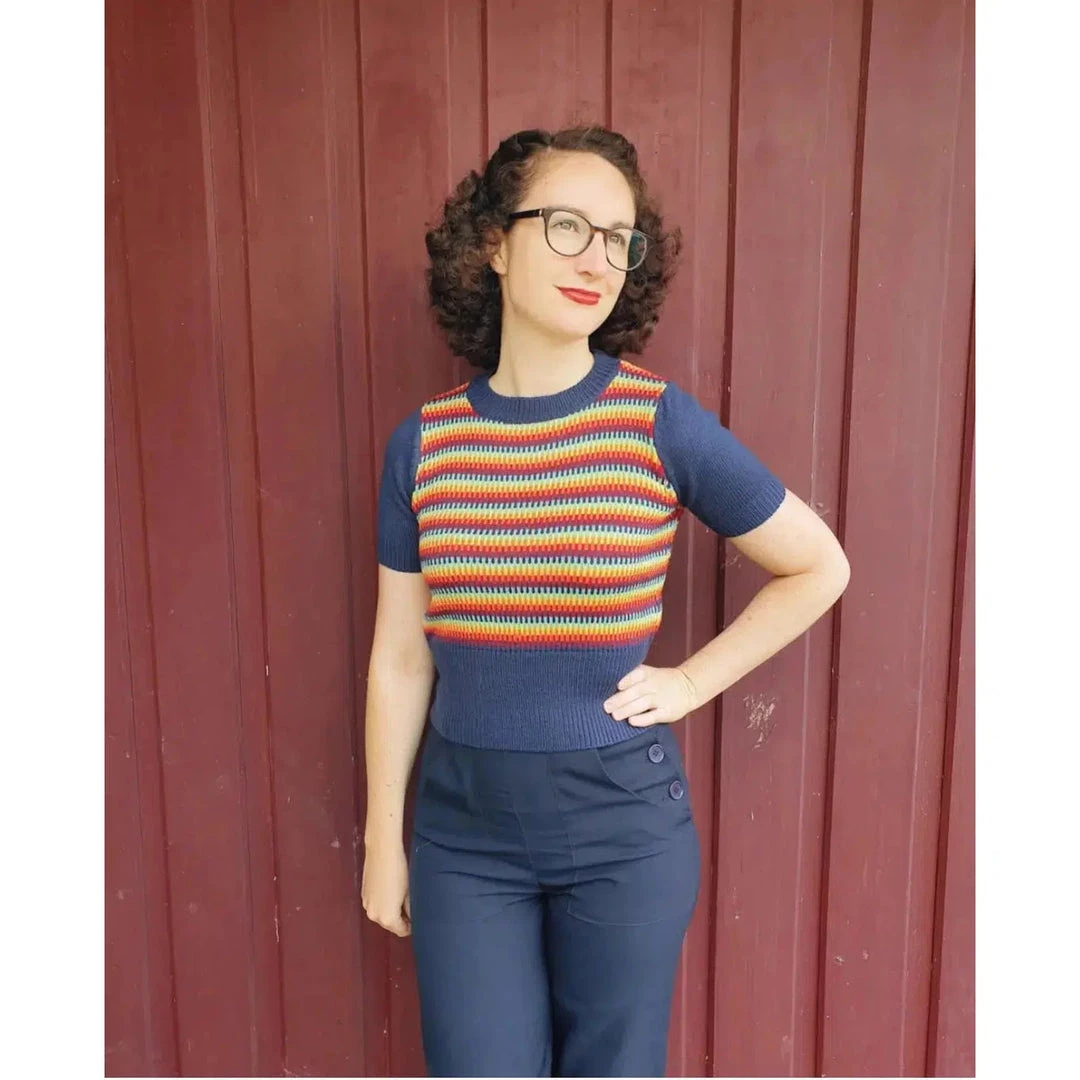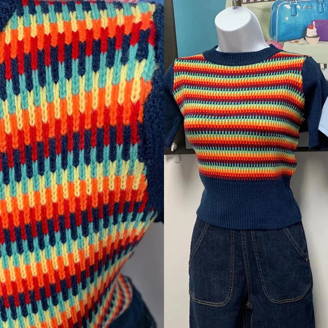 An authentic reproduction of a 1940s short sleeve sweater. It has the same fun knit pattern on the front and back in red, orange, turquoise, and yellow intertwined with a navy background.  Made with vegan acrylic yarn. Perfect with high-waisted jeans!