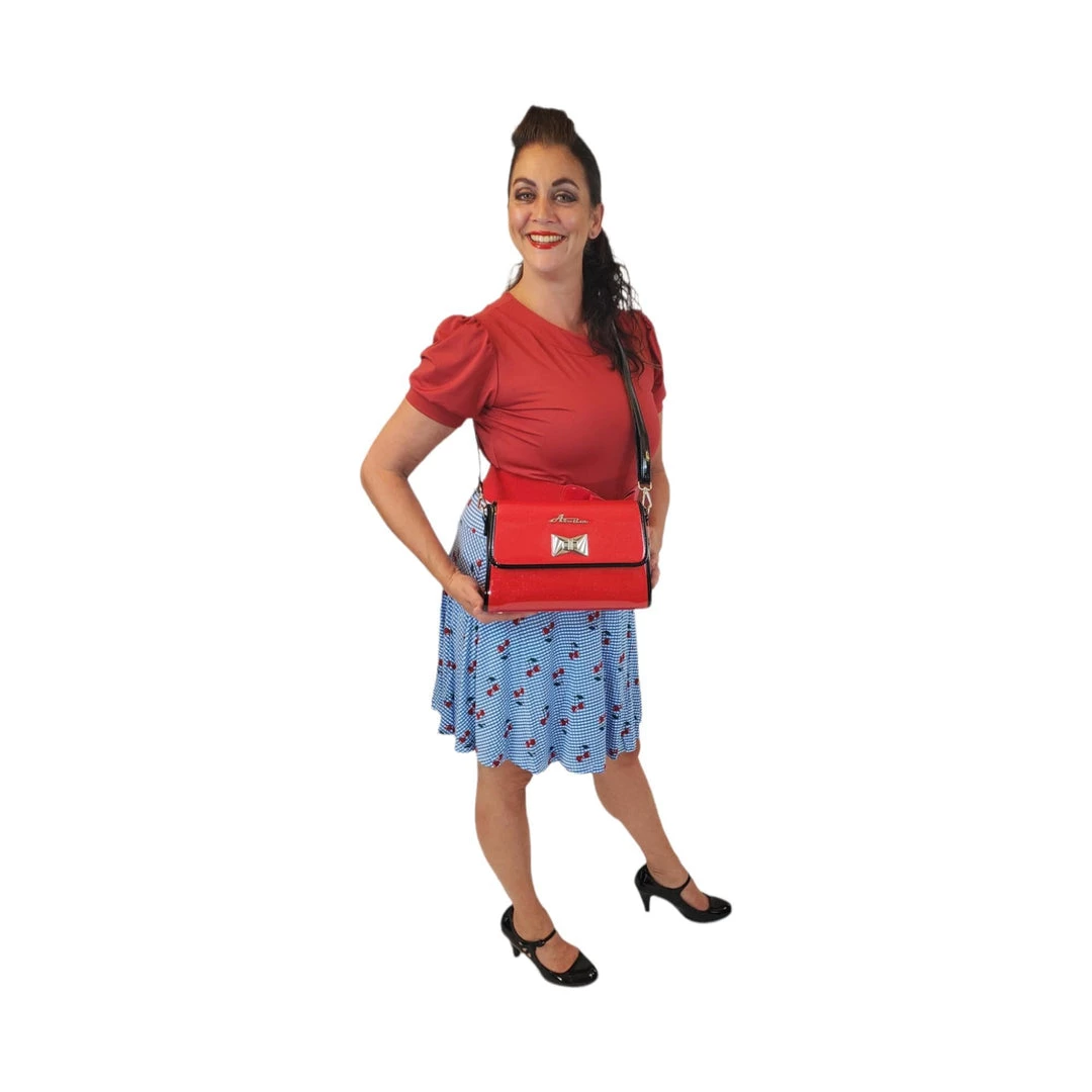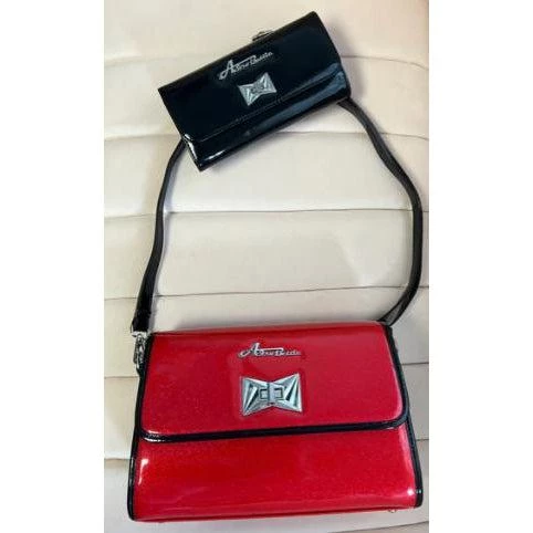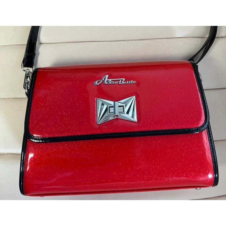 The Atomic bag from Star Struck is sure to turn heads! The perfect compliment to any outfit, this handbag is made from a vegan friendly shiny vinyl in glittery ruby red with black finishes. It features the Star Struck exclusive Art Deco-inspired clasp and their new Astro Bettie logo.