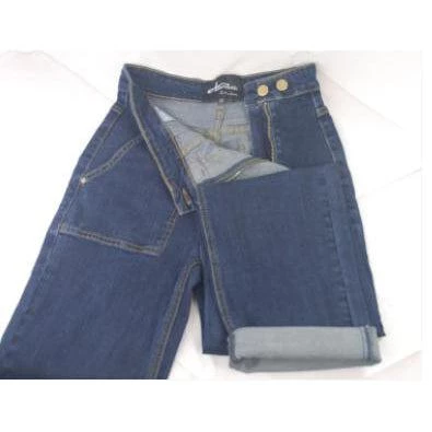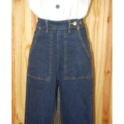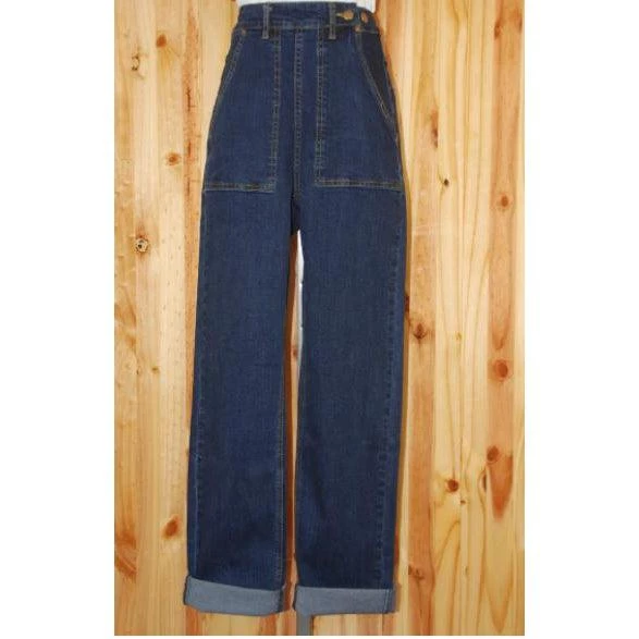 Astro Bettie Classic Ava jeans from Star Struck Clothing are high-waisted with an amazing vintage look. These durable denim blue jeans have contrasting top stitching in tan, a beautifully designed closure with a hidden zipper below brass buttons on the left side, five belt loops, gorgeous deep pockets in front, and eye-catching patch pockets on the back. Â