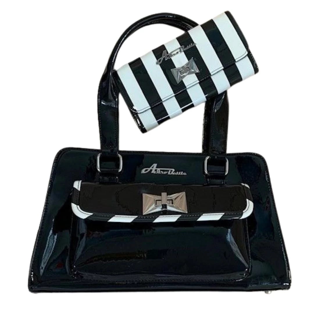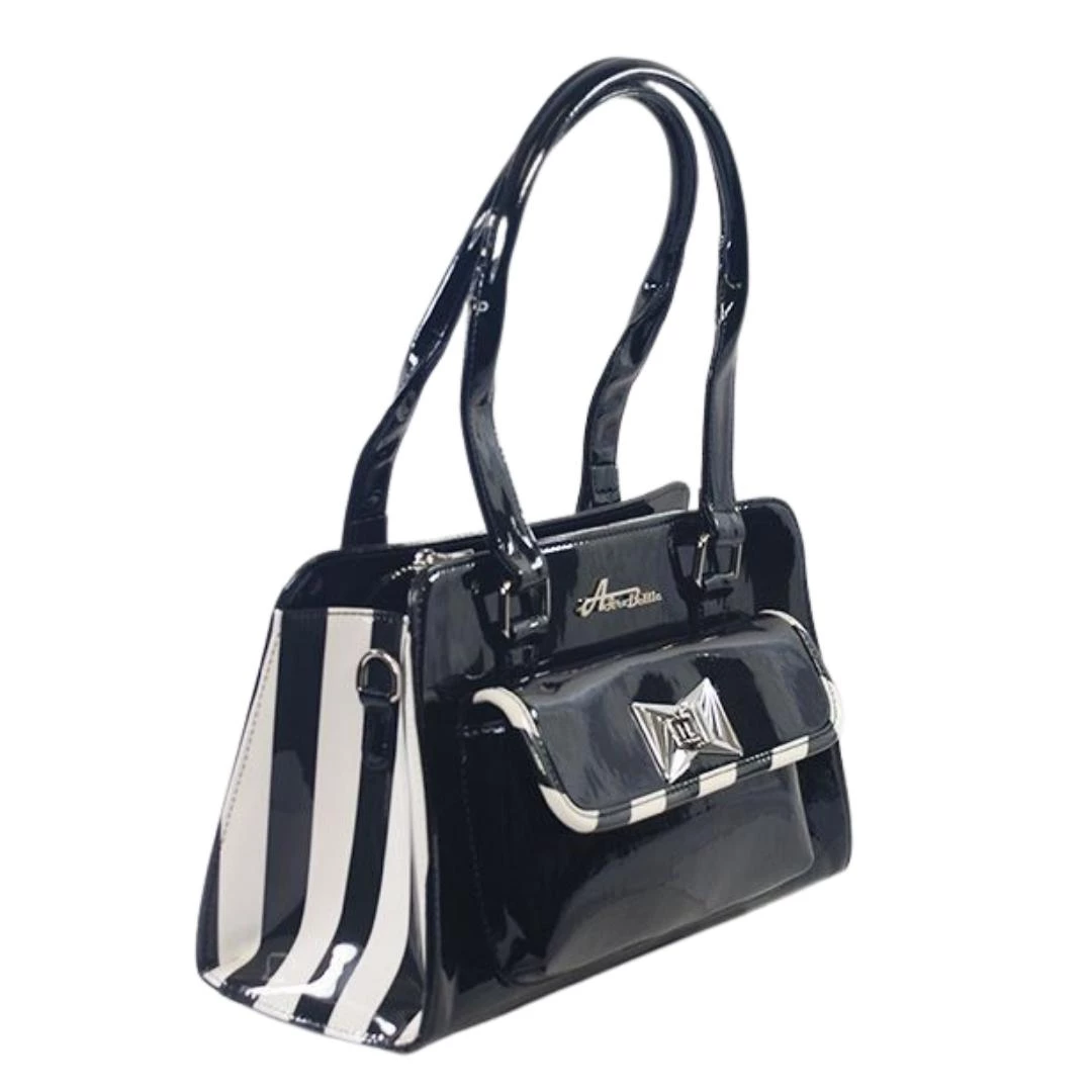 Stripe Madness! Made from vegan friendly stripe and shiny black vinyl it is sure to get noticed! This bag features Star Struck’s exclusive Art Deco Inspired clasp and the Astro Bettie logo!