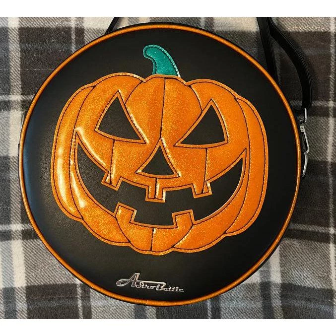 Everyday is Halloween when you carry Jack along! The Meet Jack! round handbag from Star Struck features a plump, glittery Jack-O’-Lantern on both sides against a matte black background. It has a 50″ adjustable strap to wear over the shoulder or crossbody. The interior includes a zipper pocket, a cell phone pocket, and is lined with sturdy cotton.