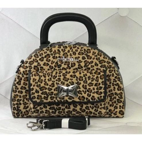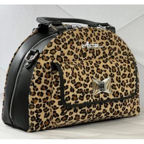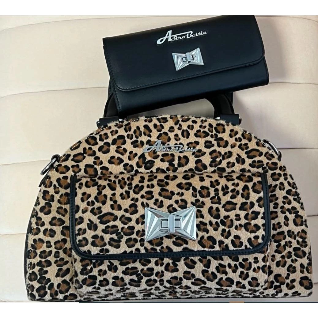 Reach for the stars with the Starlite Bag! Made from brown leopard and matte black vinyl, it features Starstruck’s exclusive Art Deco-inspired clasp and new Astro Bettie logo. The bag has grab-and-go handles and a 50″ adjustable strap to wear over the shoulder or crossbody. The interior includes a zipper pocket, cell phone pocket and is lined with sturdy cotton.