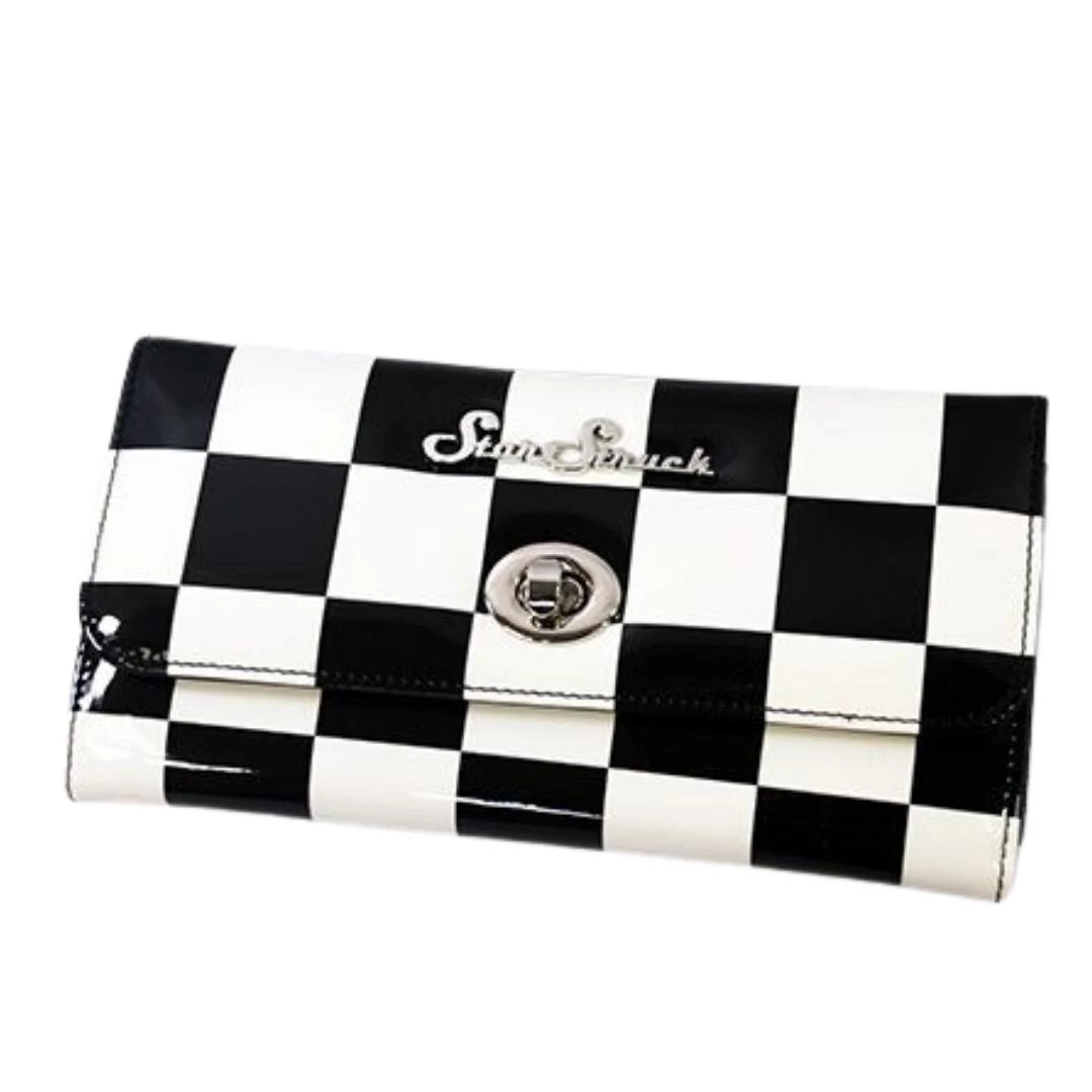 Made from Vegan Black and White Checkerboard Vinyl, this wallet is the perfect compliment to your handbag. This wallet features a coin holder, card holders and bill holder.