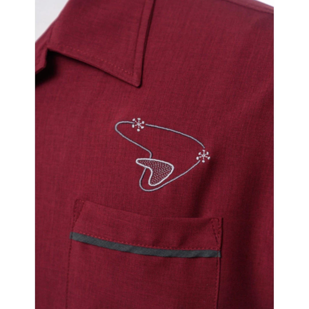 This vintage-inspired style takes a cue from mid-century design with its mod geometric boomerang embroidery, and cool vintage colors of ruby, charcoal, and silver. The left chest pocket is trimmed with a charcoal band for a little extra appeal!