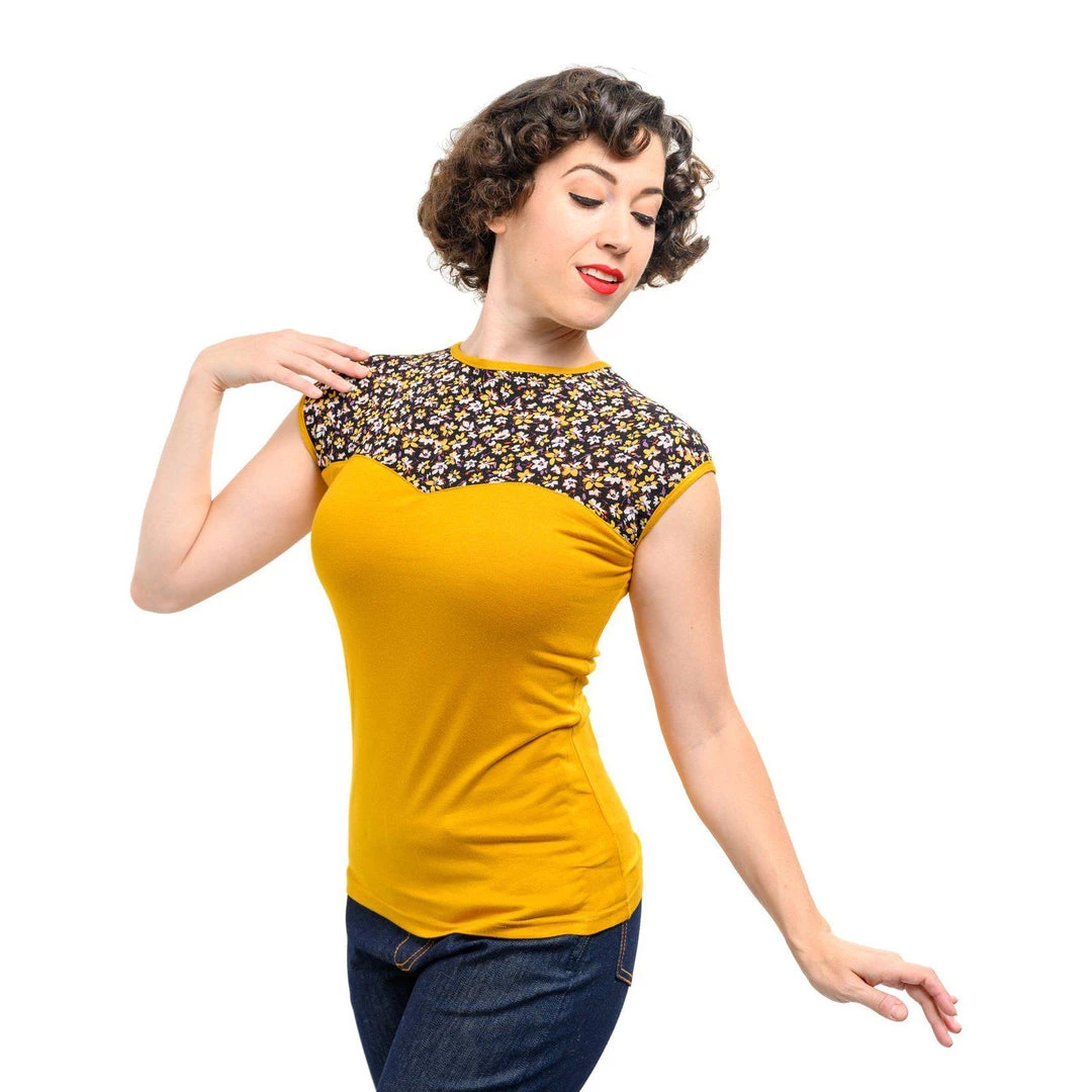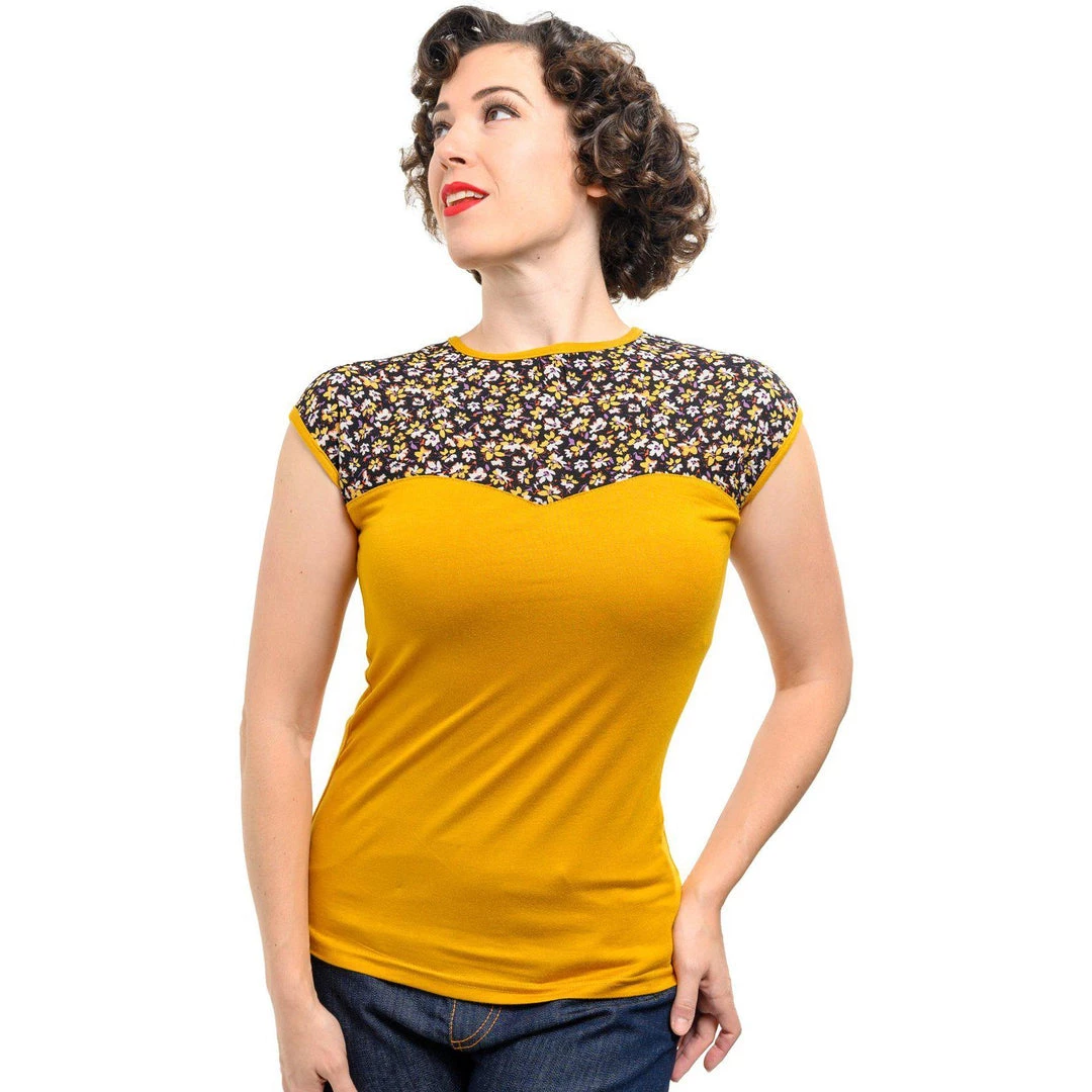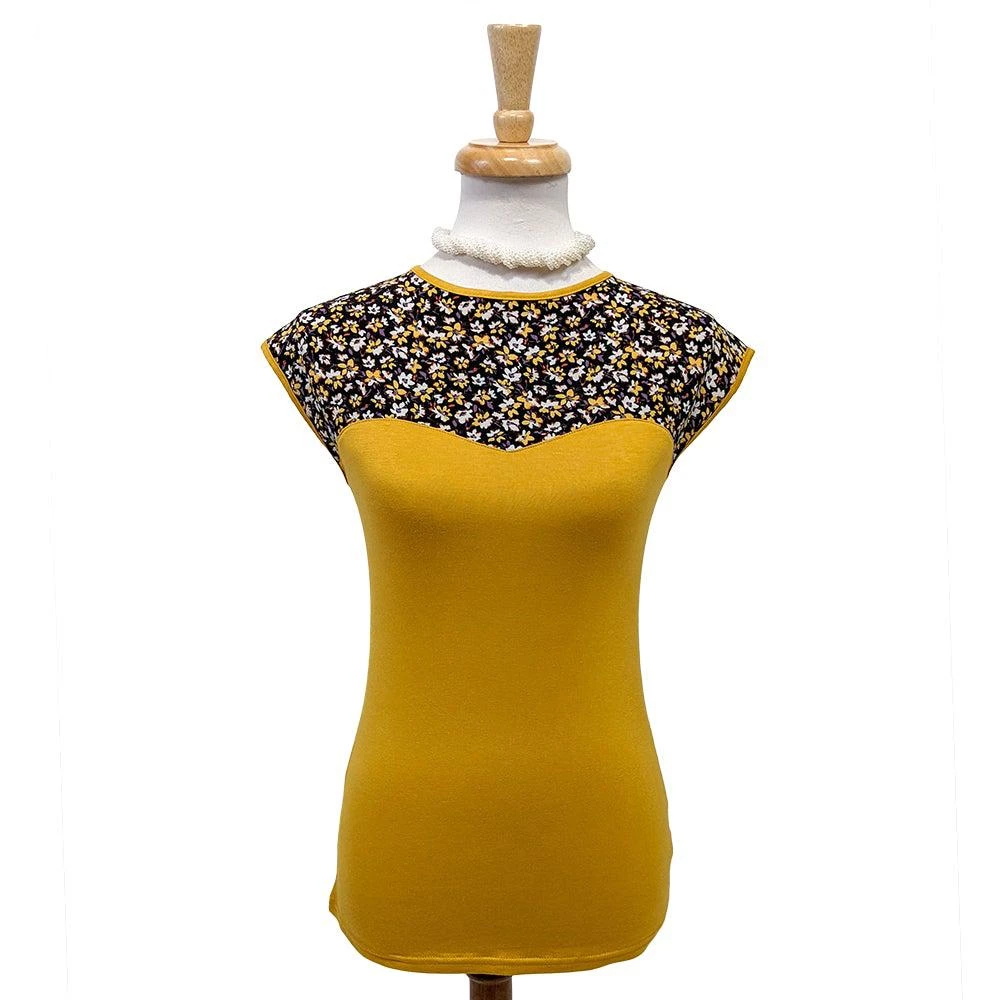 A classic sweetheart top with the body in solid mustard yellow and pop of color on top in a delightful floral print on a black background. This sensuous top has a peek-a-boo accent in the back for an additional wow factor.