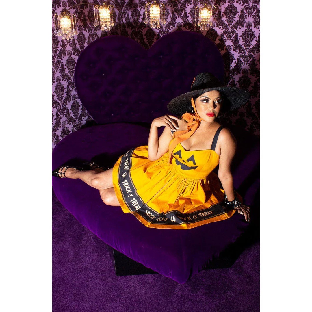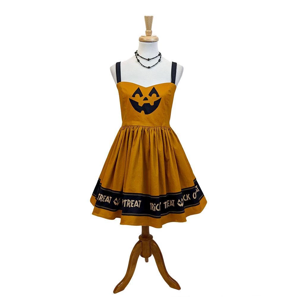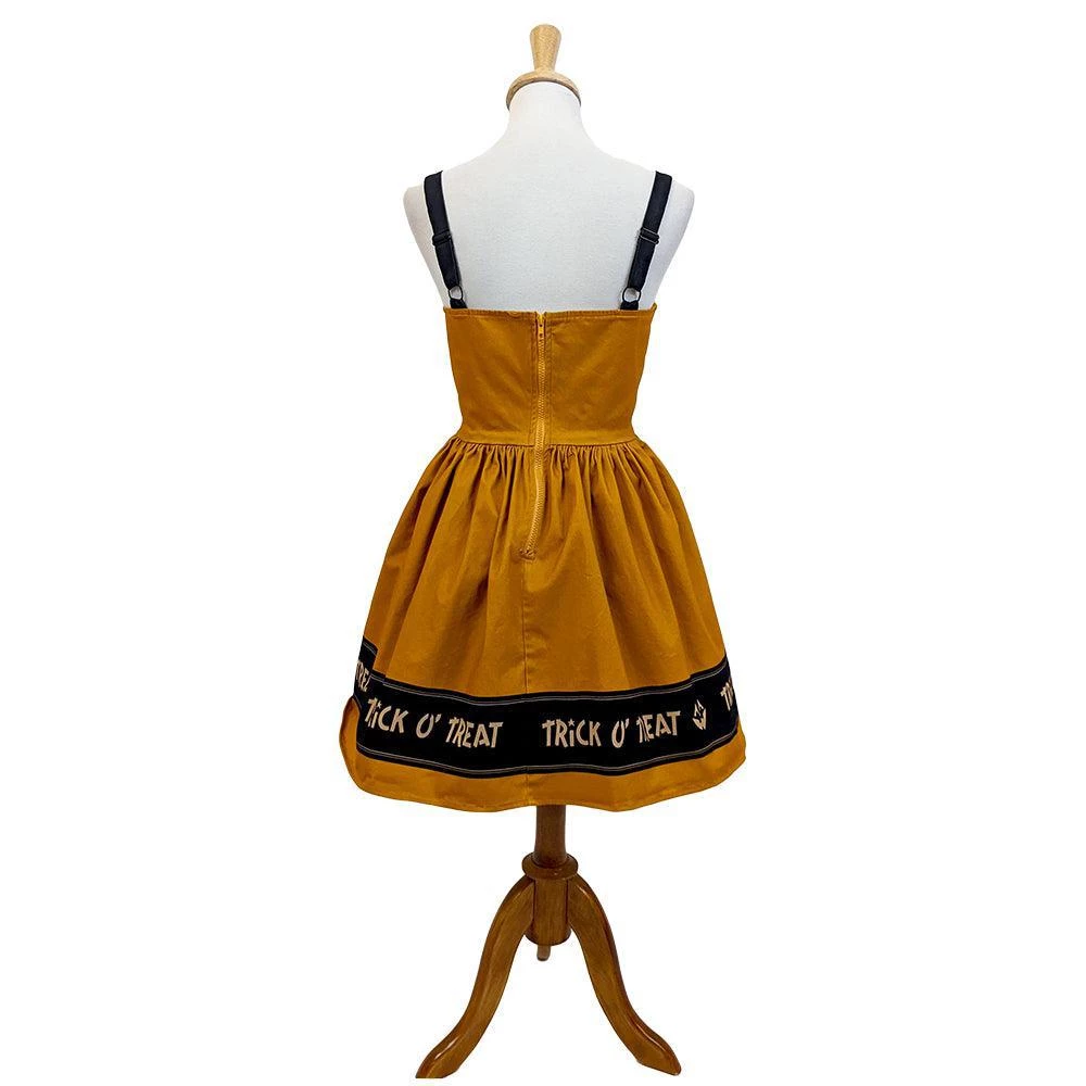 What a treat to wear this super fun pumpkin orange dress from The Oblong Box Shop with its perfect pinup styling and sass!! It has a short gathered skirt, fitted sweetheart bodice with a cute pumpkin face, adjustable straps, and side seam pockets. The skirt is finished in a classic-font “Trick O’ Treat” banner along the border.
