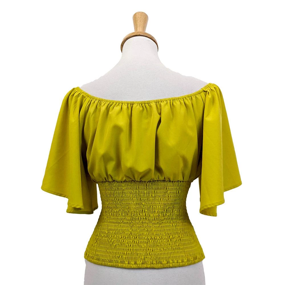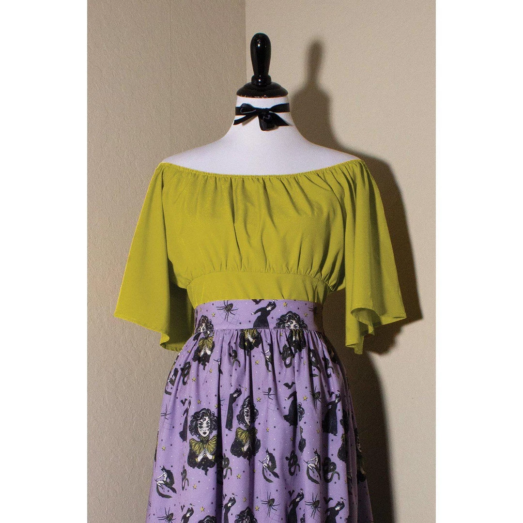 It’s time to do the monster mash in this chartreuse top from The Oblong Box Shop! The peasant-style design is elasticized around the neck and shoulders for a super flattering bustline. It has flutter sleeves and elastic shirring on the back for a great fit.