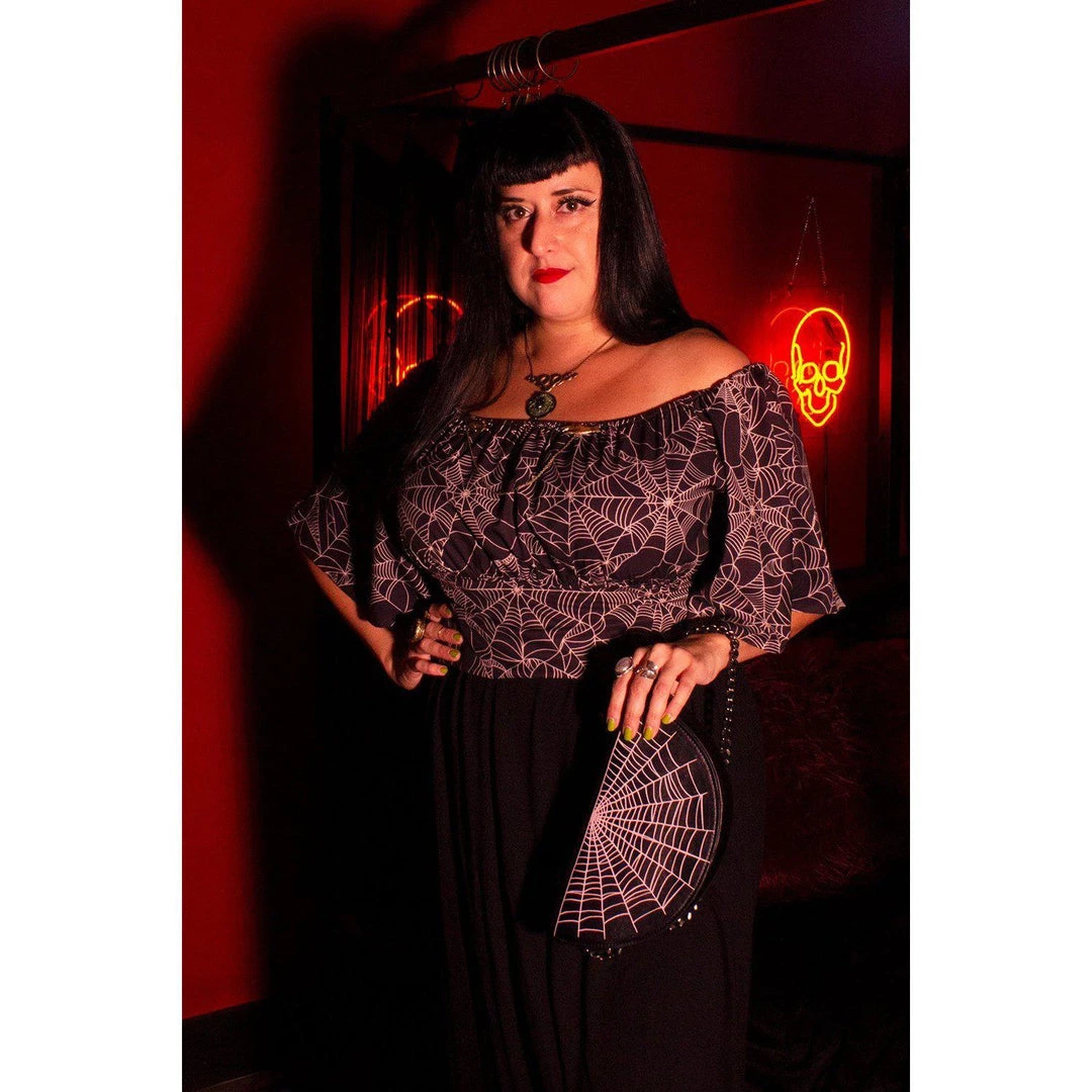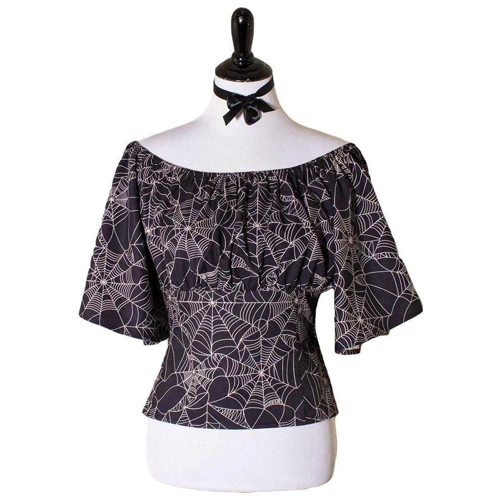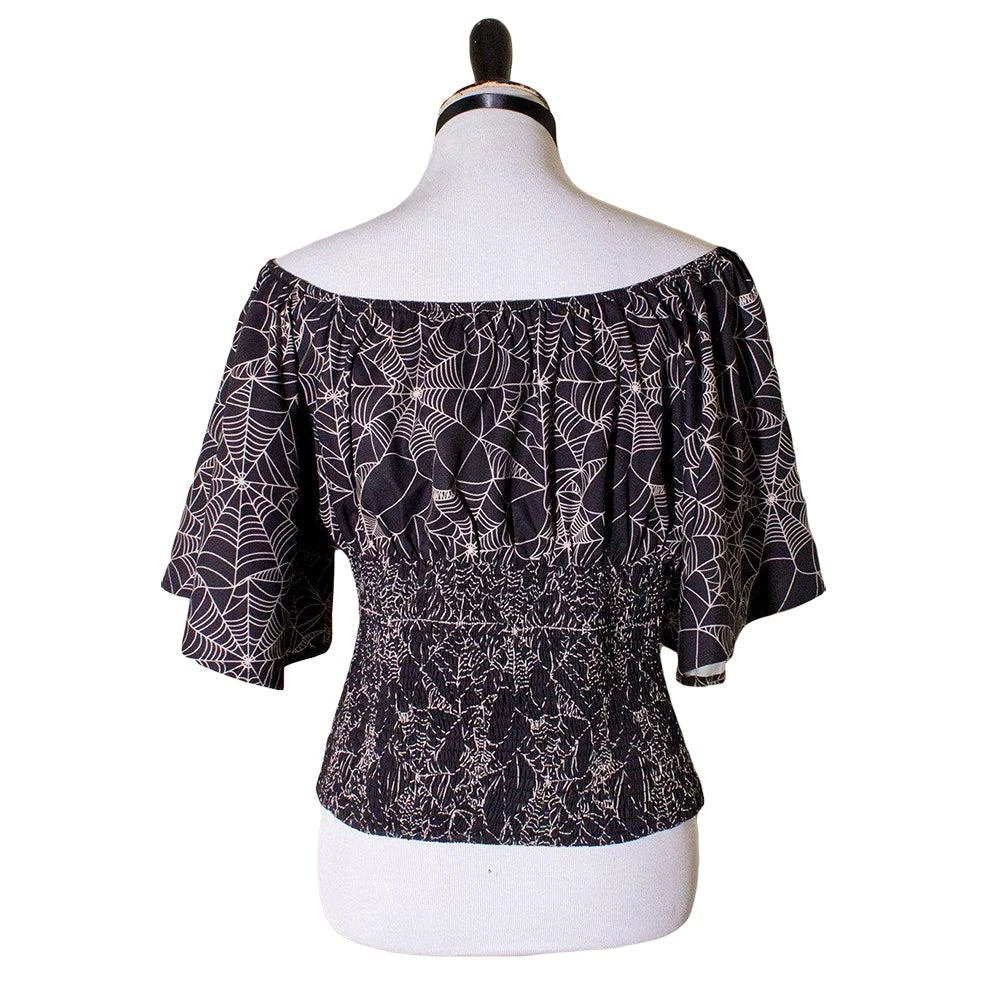 Weave a wicked spell in this top from The Oblong Box Shop! The peasant-style design is elasticized around the neck and shoulders for a super flattering bustline. It has flutter sleeves and elastic shirring on the back for a great fit.