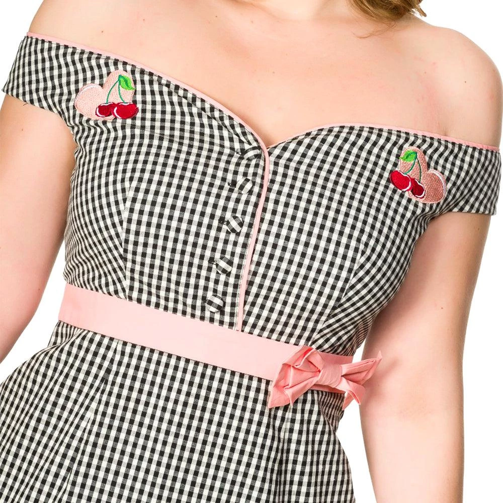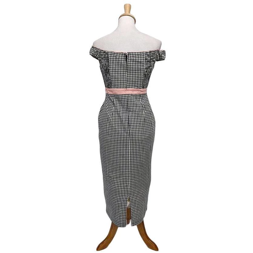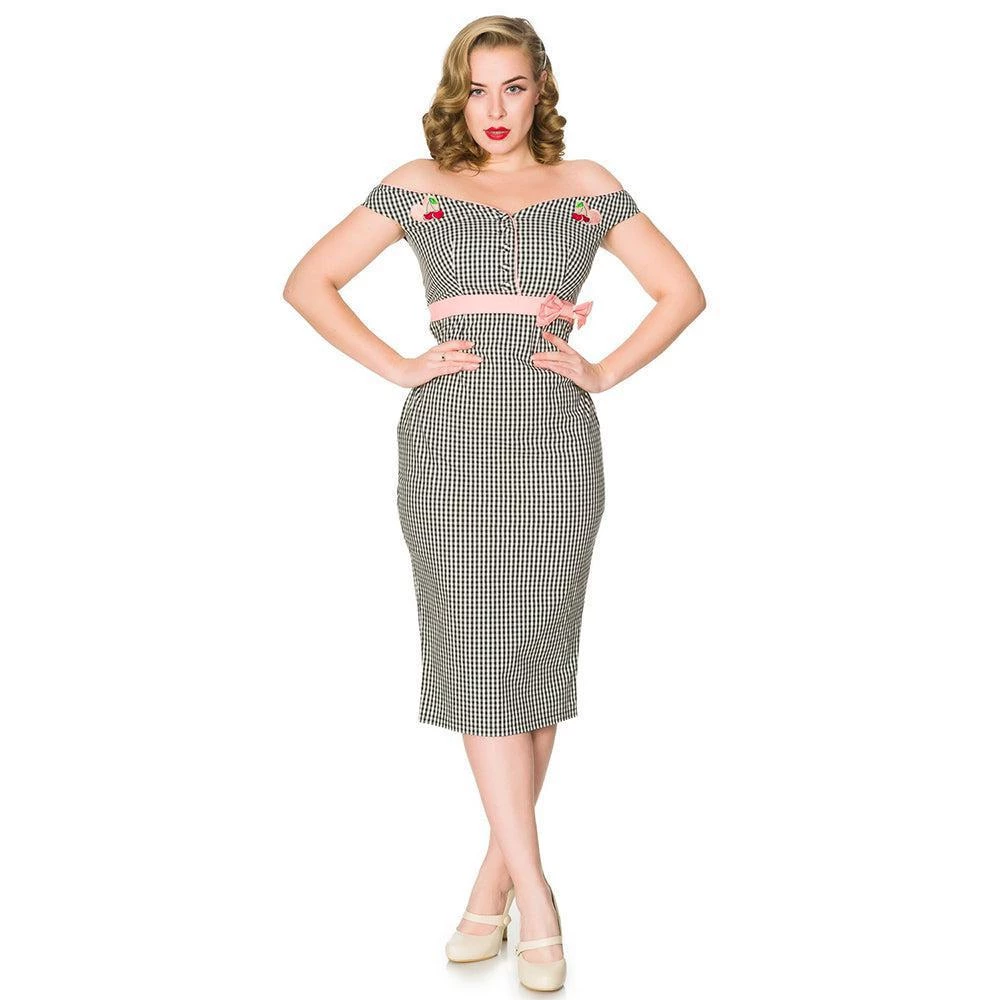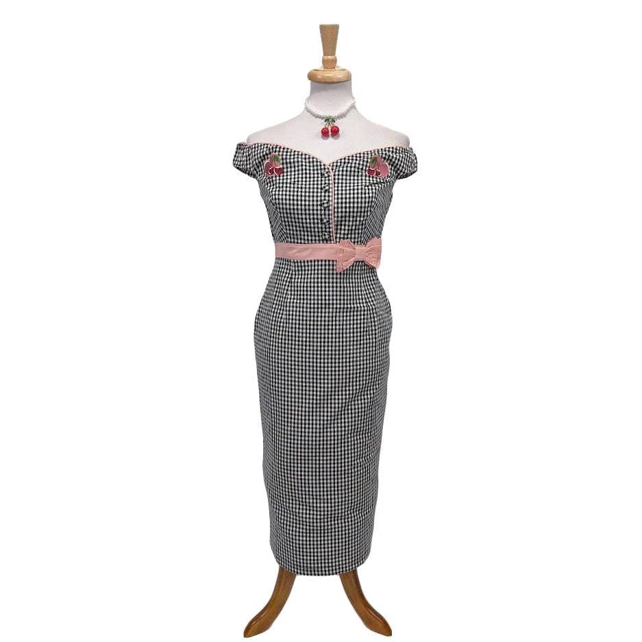 Rockabilly romance, gals! This marvelous cotton frock features a dazzling black and white gingham pattern throughout the sultry wiggle silhouette. The ravishing off-shoulder neckline and button-up bodice are highlighted with pink piping while sweet embroidered patches of hearts and cherries sit on the front. The pink banded waist is embellished with a sweet faux bow and cinched with a back zipper as the darted pencil skirt drops past your knees, complete with a back vent for sultry struts!