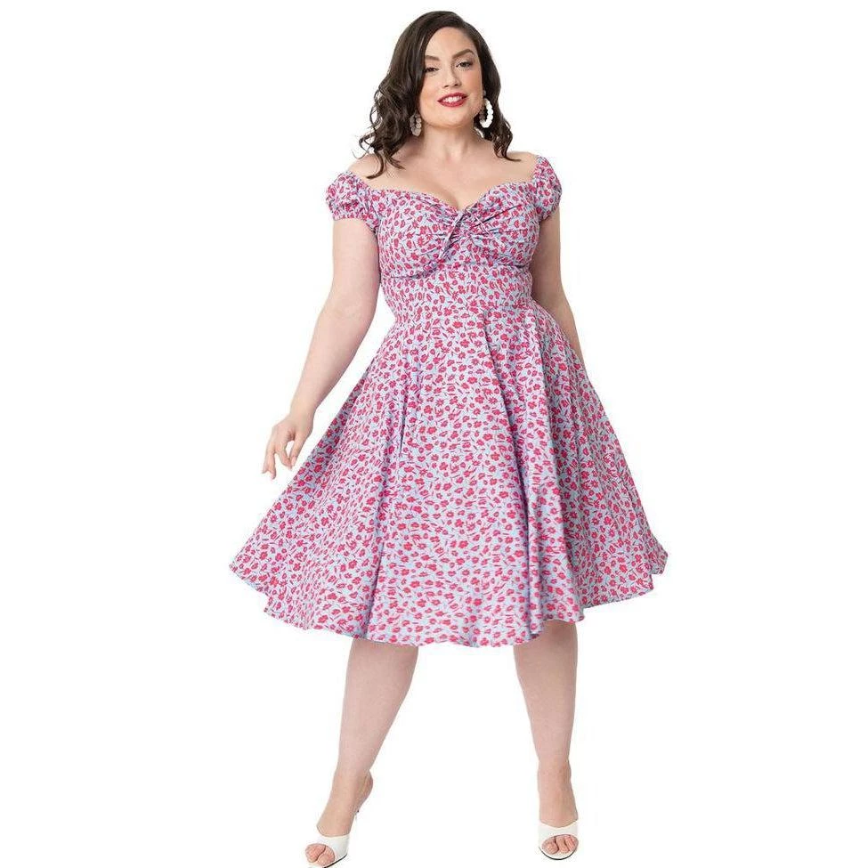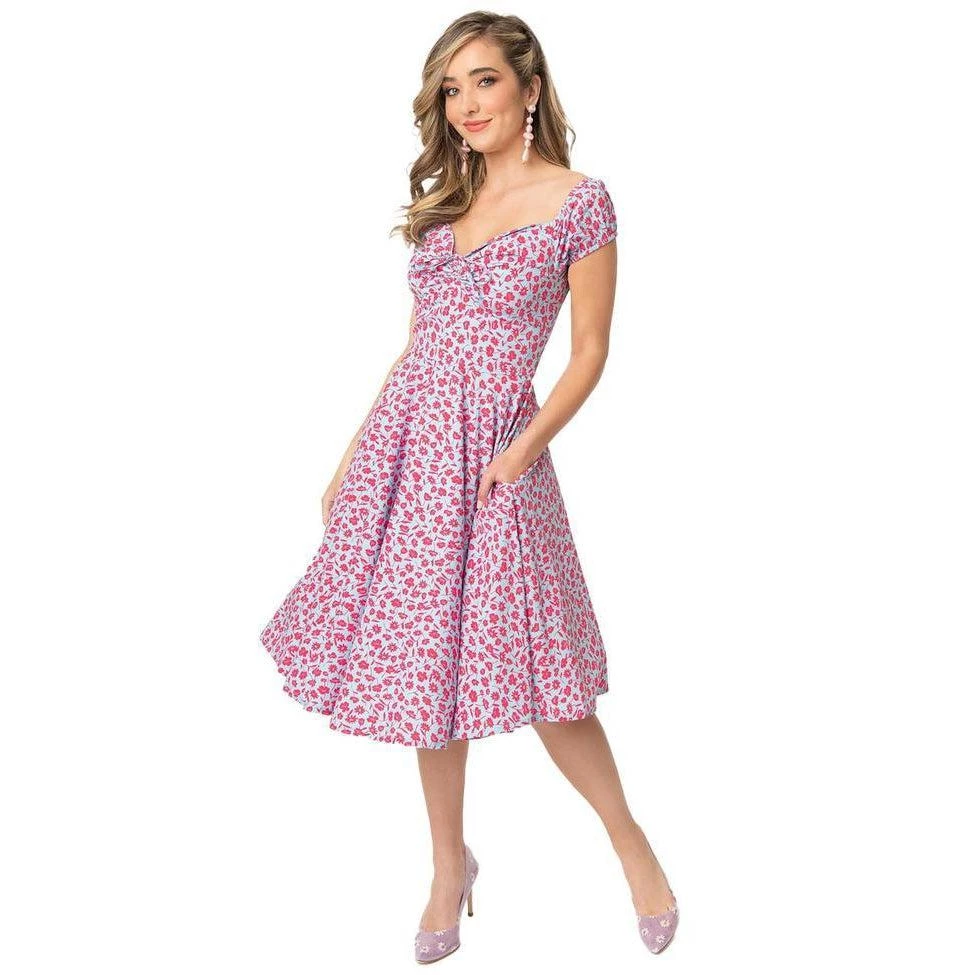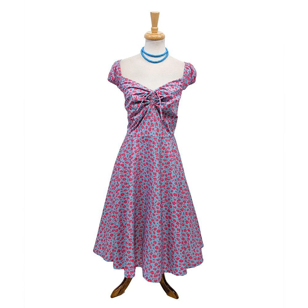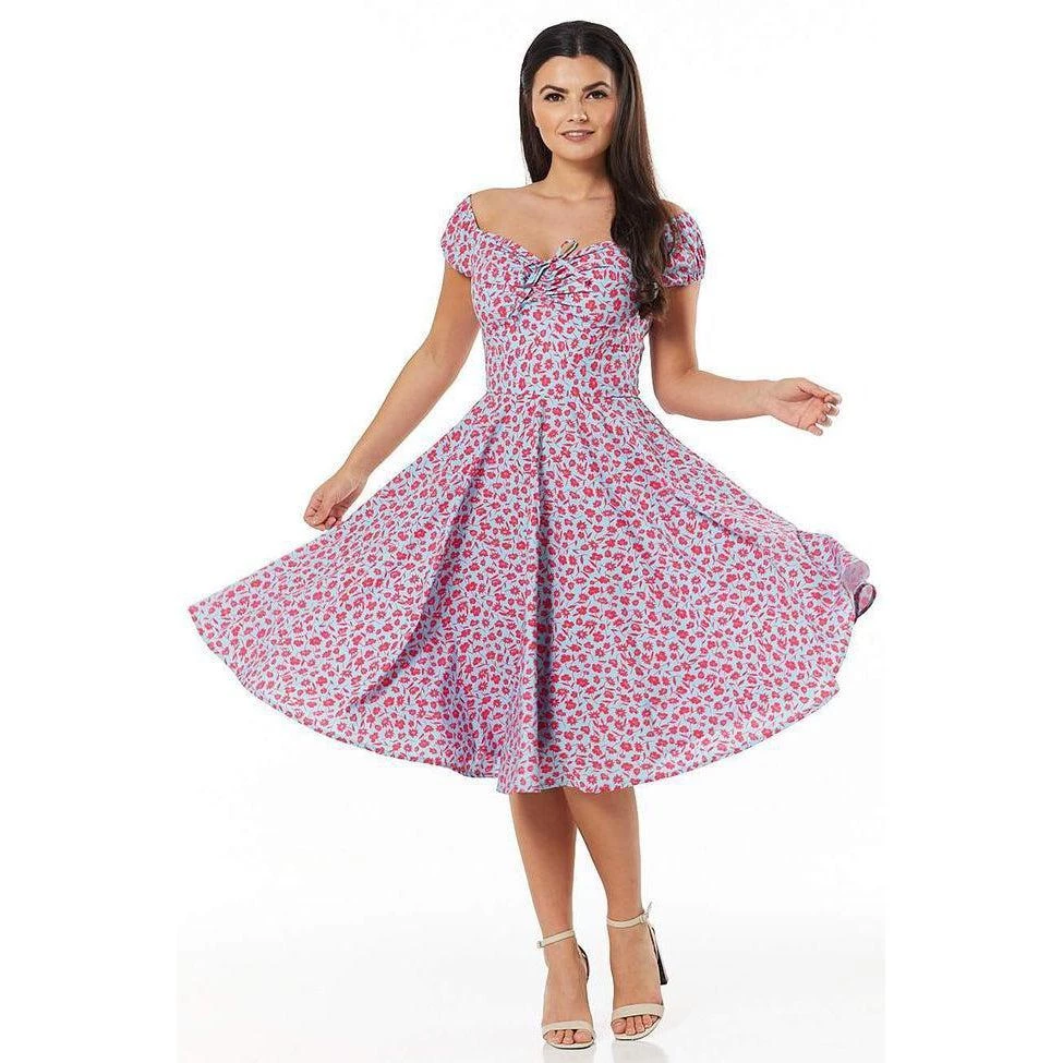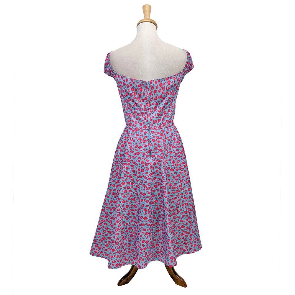The Victoria Fifties Swing Dress from Timeless London is a must have for every vintage-inspired wardrobe! This baby blue dress features a red floral print, while the off-shoulder puff sleeves are gently ruched and lead to the centered adjustable bow. Created for twirling around in, the mid-length flared swing skirt is complimented by the fitted waist which will flatter all figures. And yes, it has pockets! Team with your favorite pearls, oversized sunglasses and a wide brimmed hat for ultimate classy Hollywood feels!