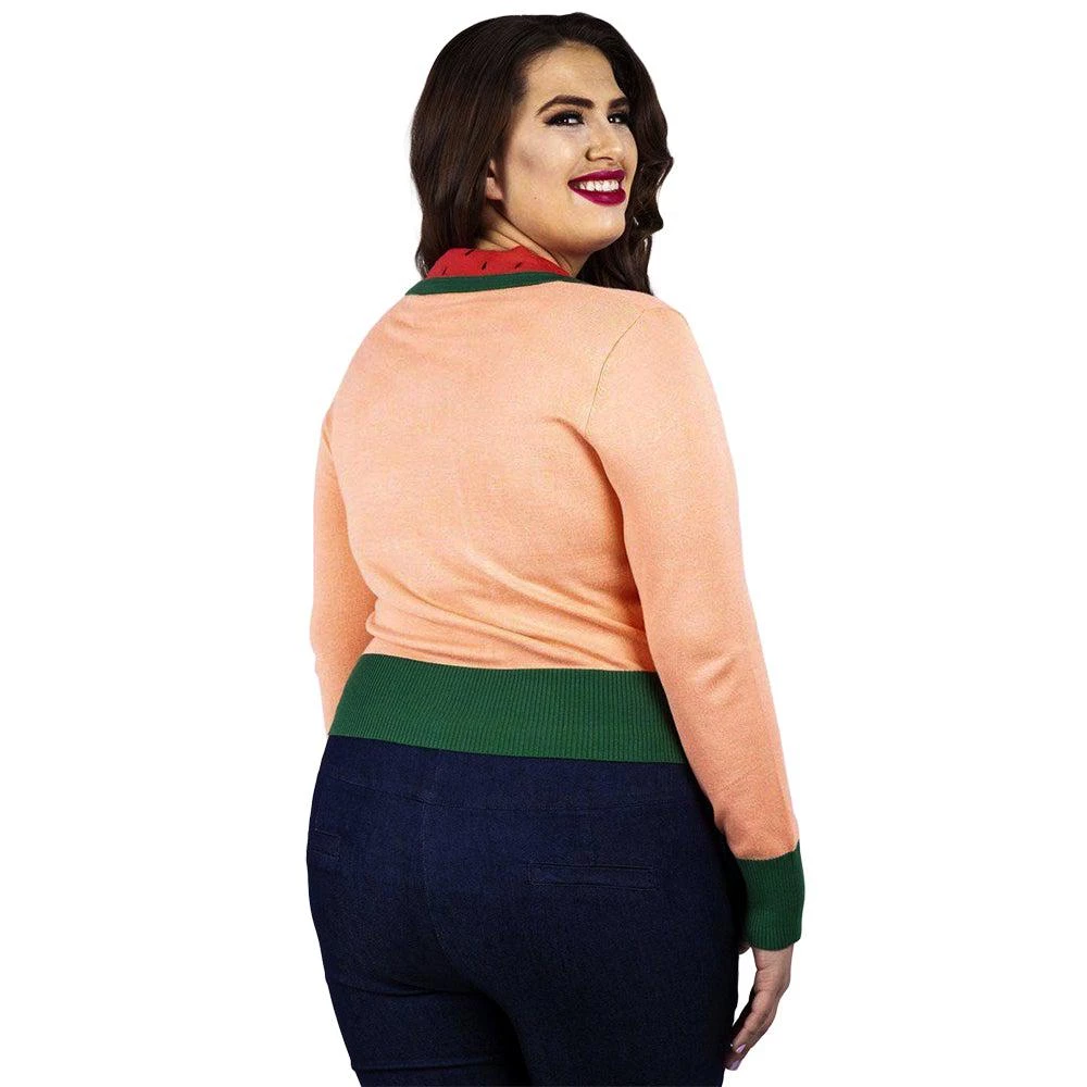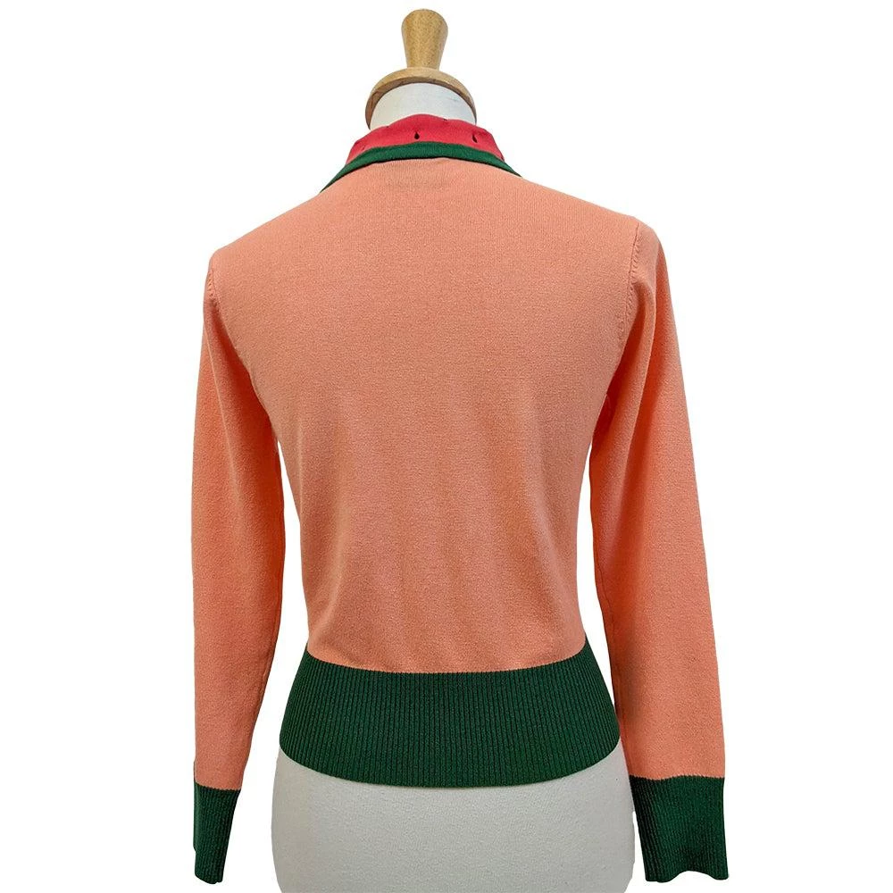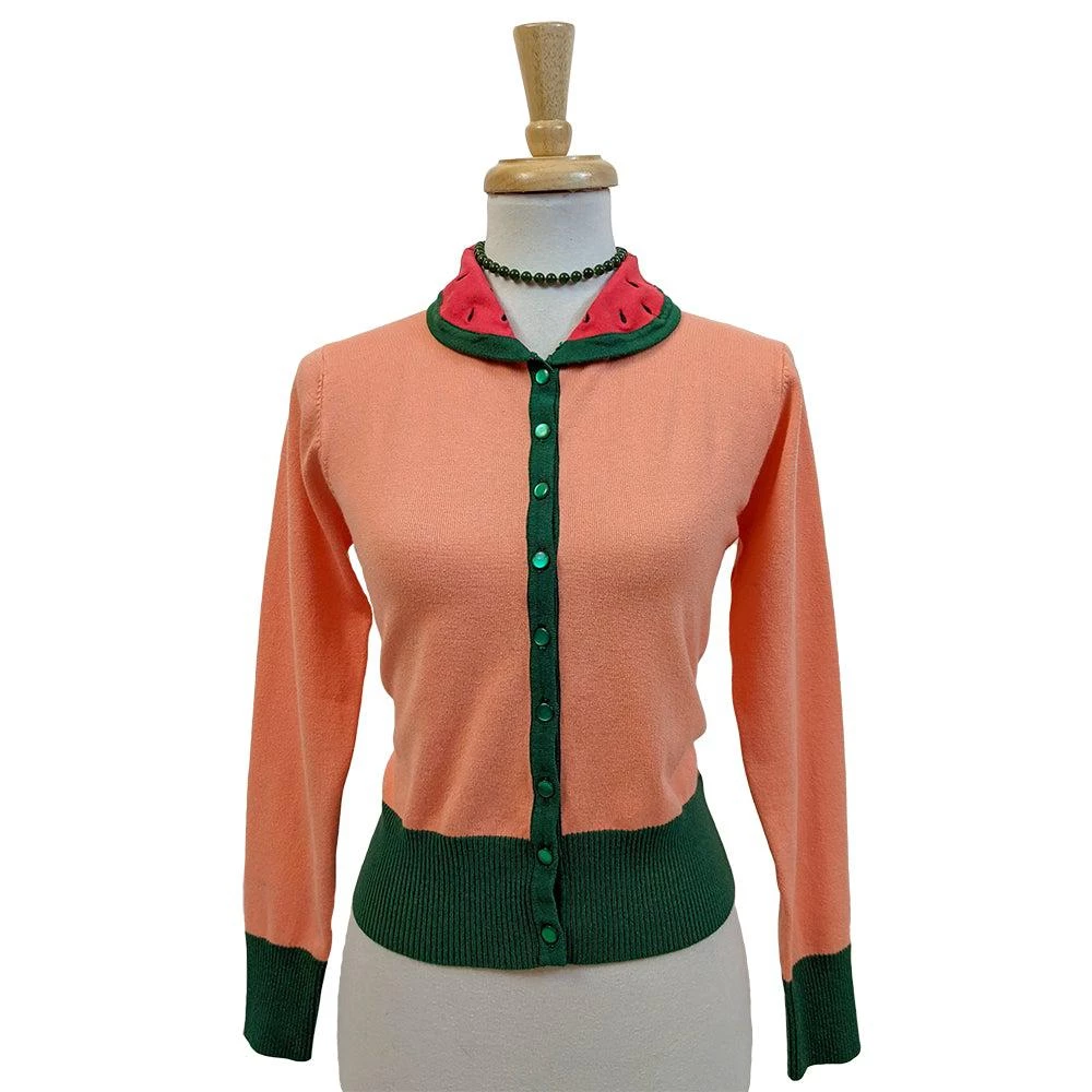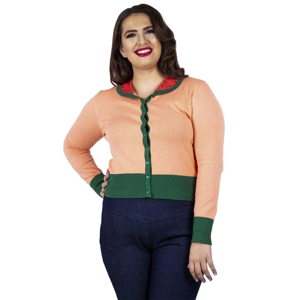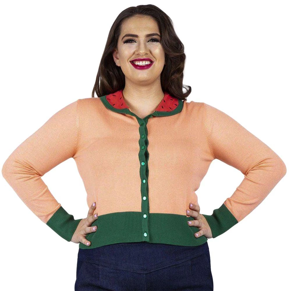 This cardigan from Voodoo Vixen is as sweet as a summer watermelon! The Baby Watermelon cardigan has a pink base with contrasting ribbed green cuffs, button placket, and hem. It has matching green buttons and a delightful red watermelon collar. This piece is definitely one in a melon!Â