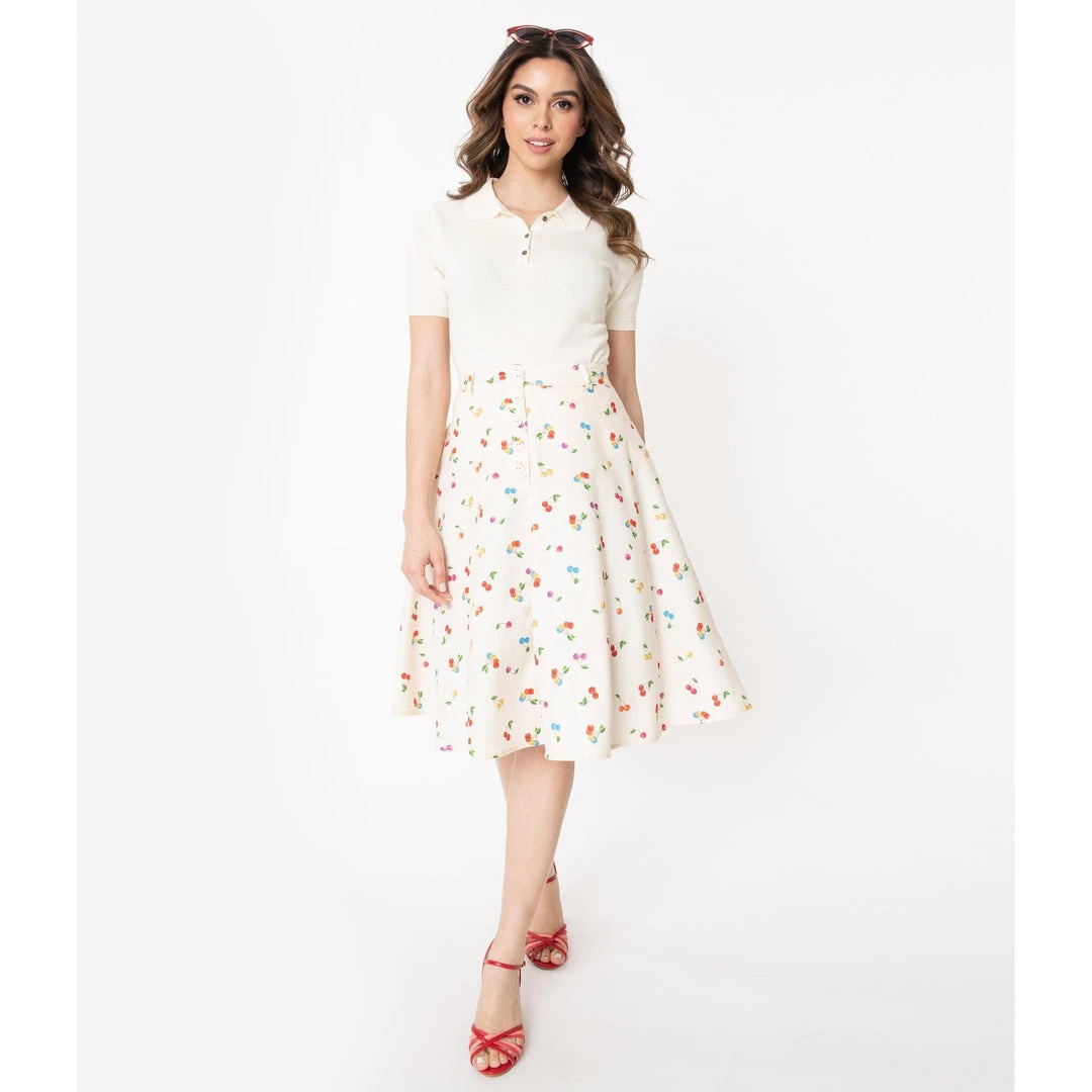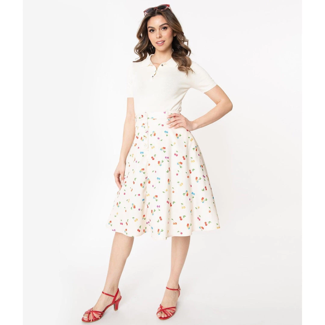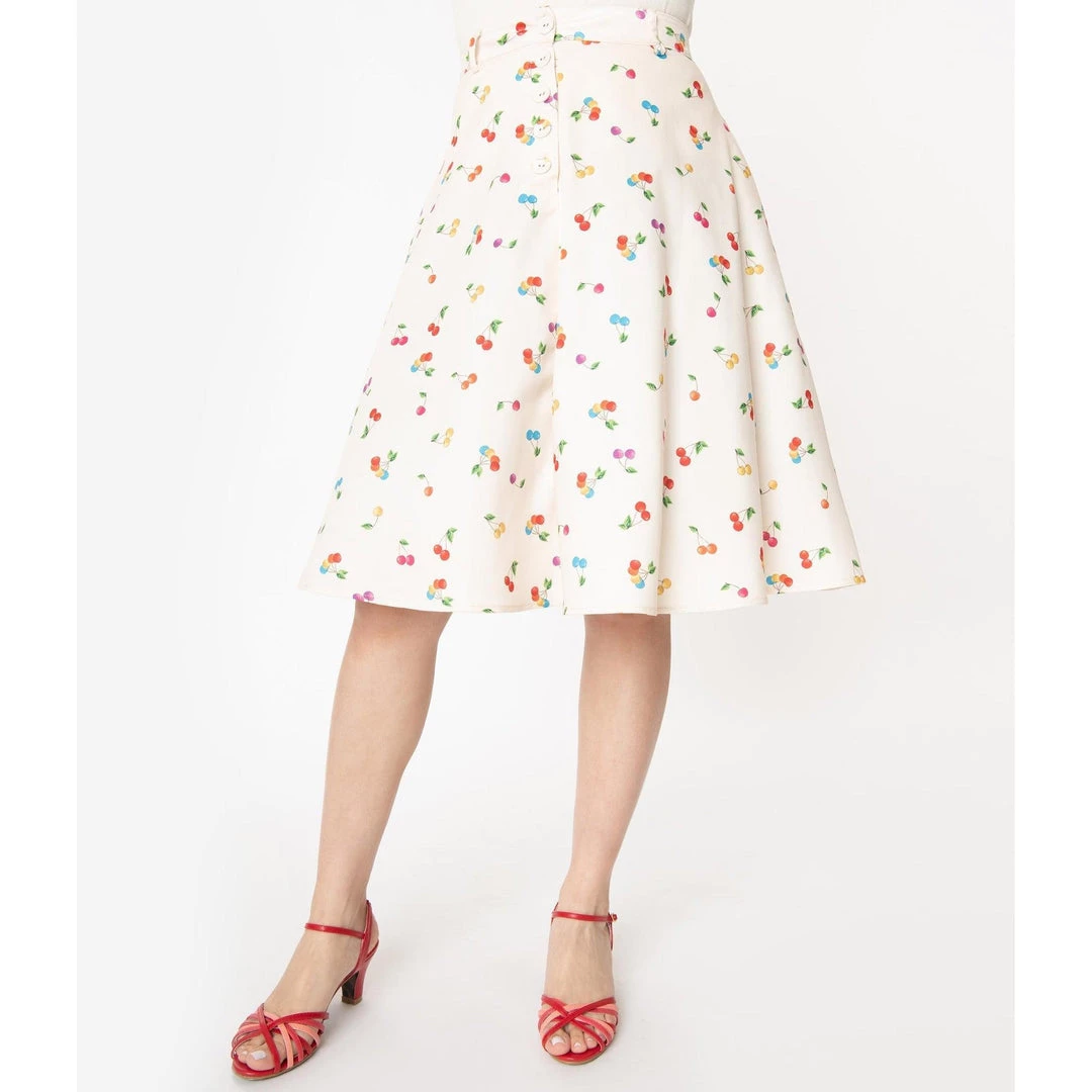 Voodoo Vixen’s Charlie skirt is a retro-styled swing skirt in a wonderful multi-colored cherry print on a cream background. Totally twirlable, it has a high waist accentuated in the front with a verticle row of cream buttons. Zips up the back.