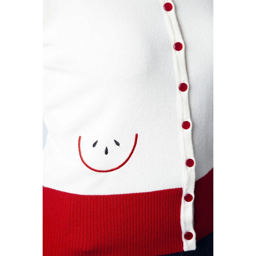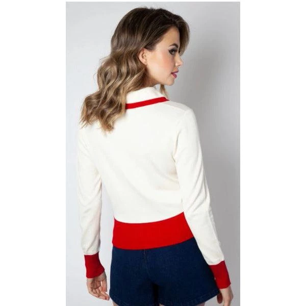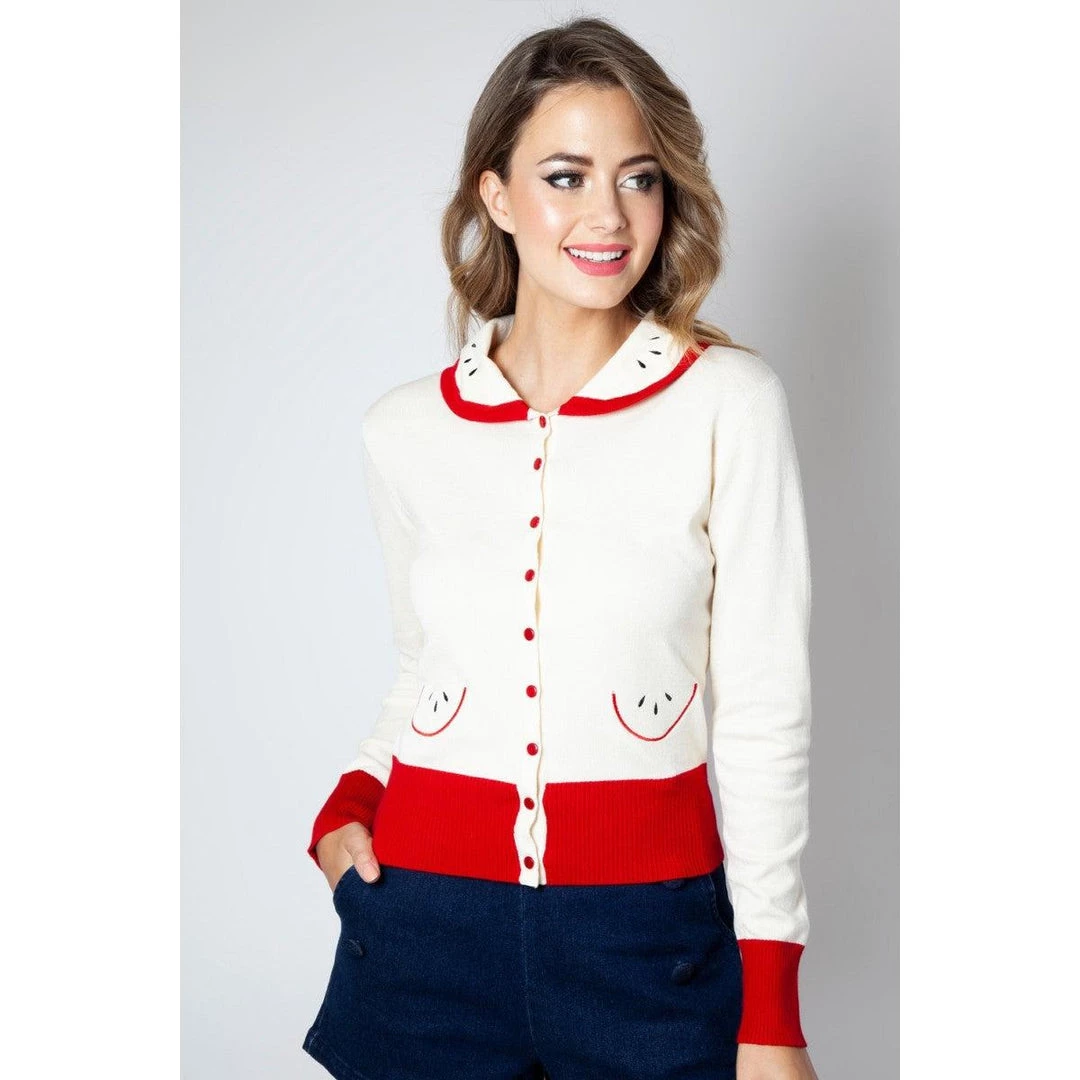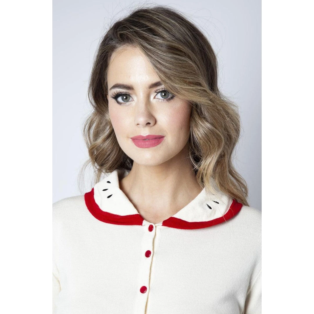 Be the apple of your own eye in this super cute cardigan from Voodoo Vixen! This long-sleeved cardigan is white with red accents. The peter-pan collar looks like a pair of apple slices with red edging and black seeds. The sleeve cuff and hem are red ribbing. The front has cute little embroidered apple slices.  Fastens with shiny red buttons.Â