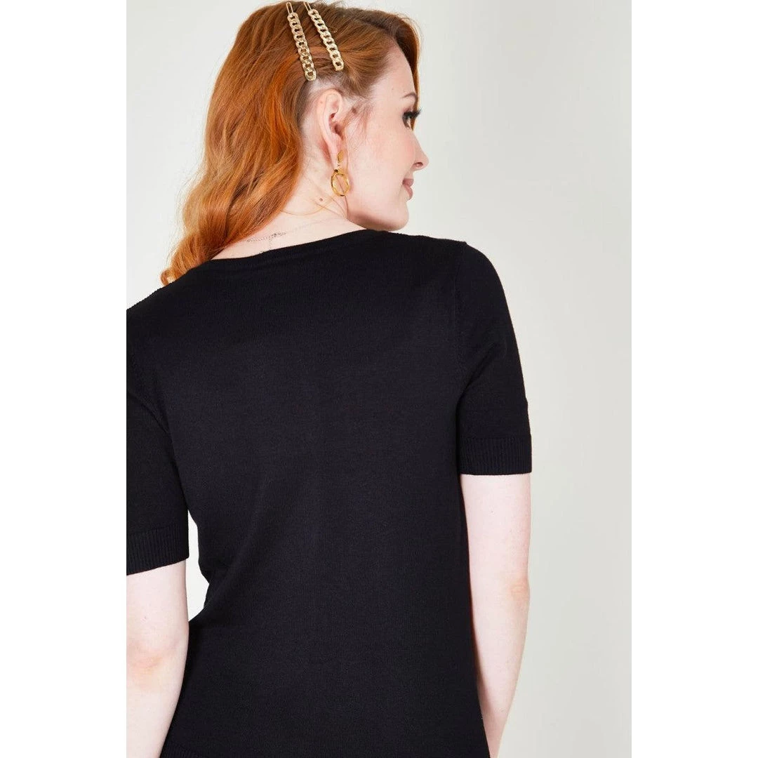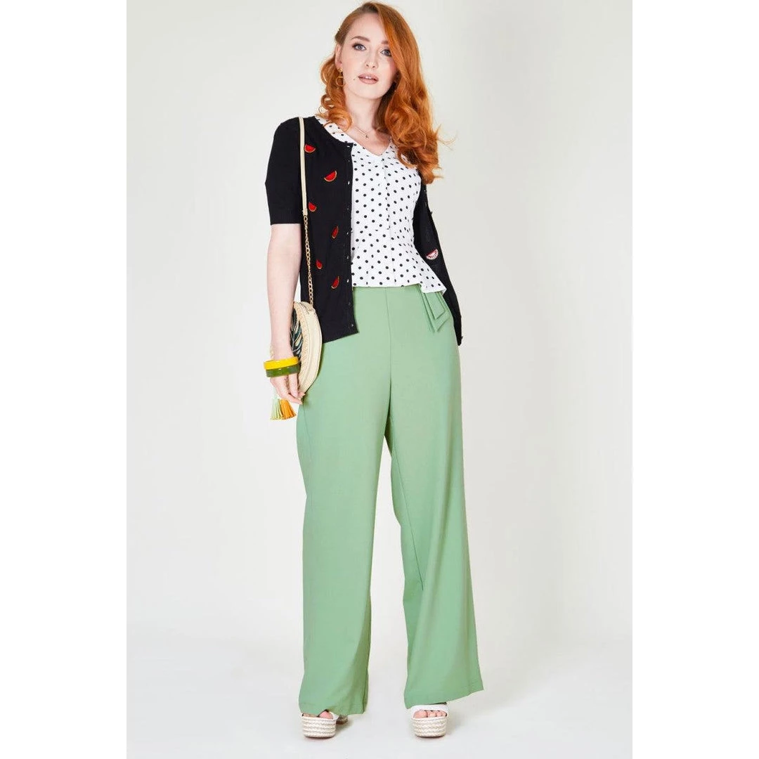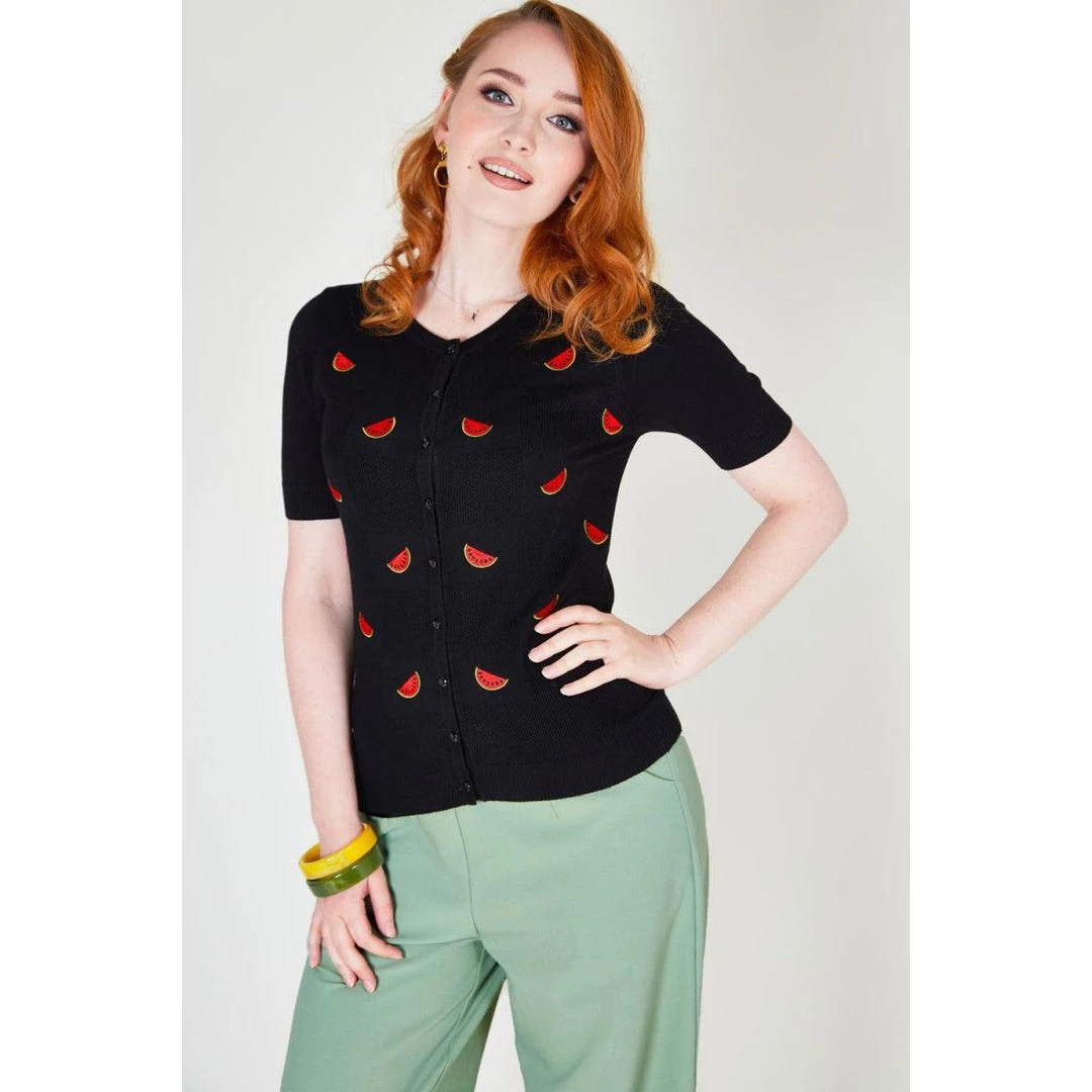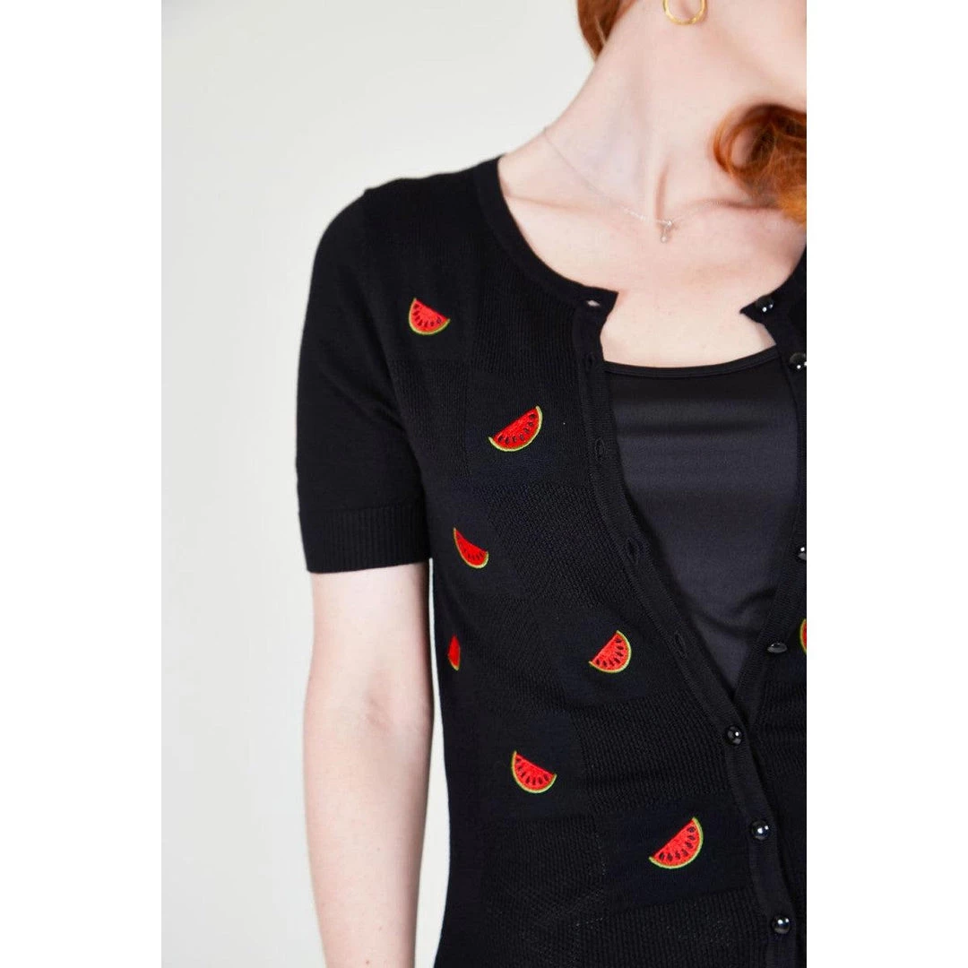 Sweeten up your wardrobe in this fruity fun cardigan scattered with bright red embroidery melons all across the front. It has sleeves cut above the elbow with ribbed cuffs, the hem is ribbed, and it buttons up the front with matching black buttons.