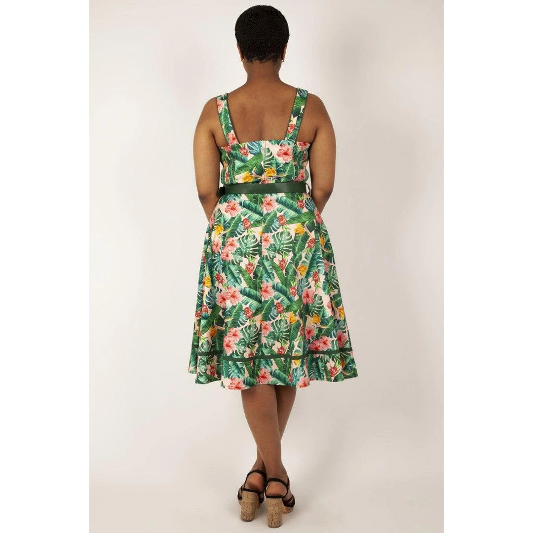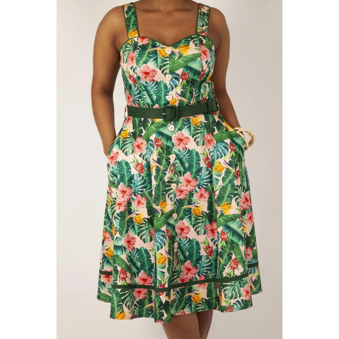 The full-skirted Jinkx dress from Voodoo Vixen is a tropical dream! The 50s styling features nice, wide adjustable straps, a sweetheart neckline, a fitted bodice with pretty heart buttons, and elasticized side ruching to give you a perfect fit. The flared skirt has side seam pockets and a band of deep green binding above the hem. It zips up the back and includes a deep green removable belt. Â