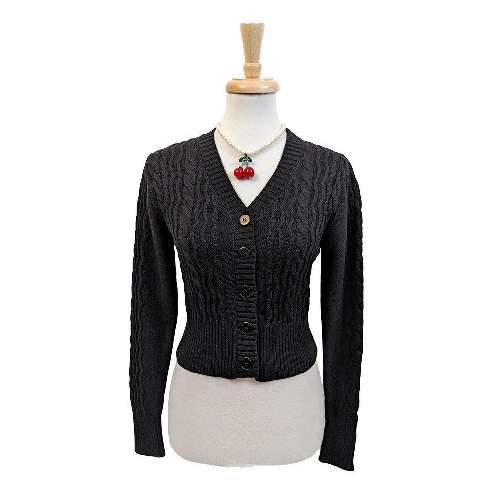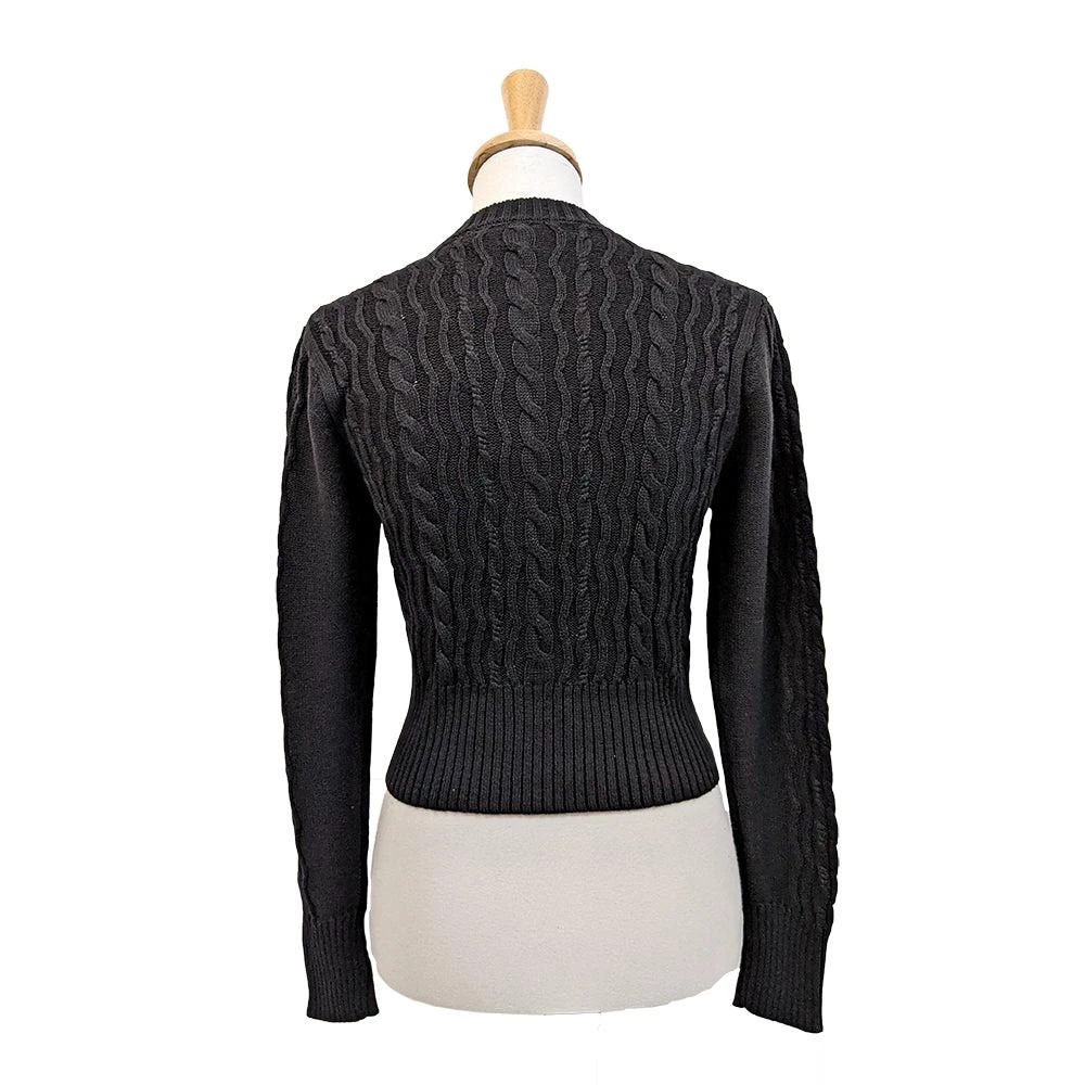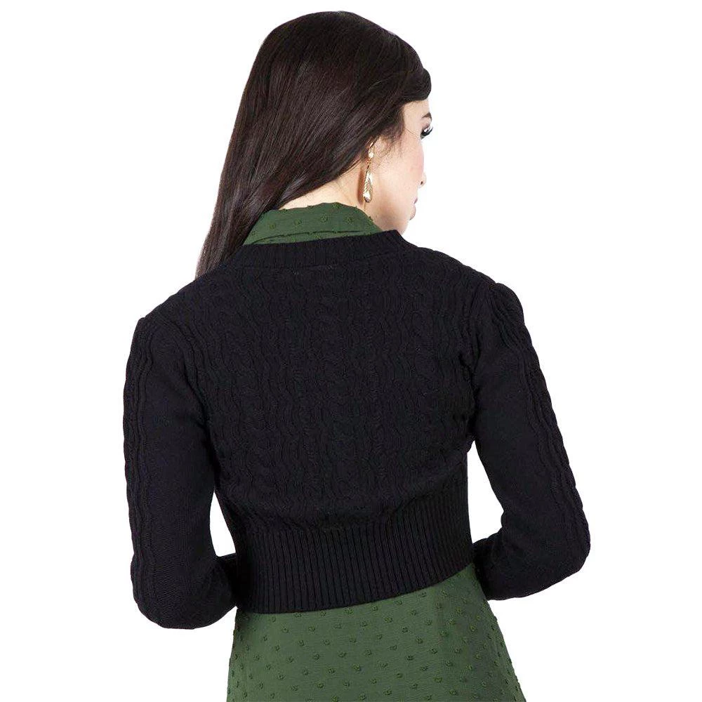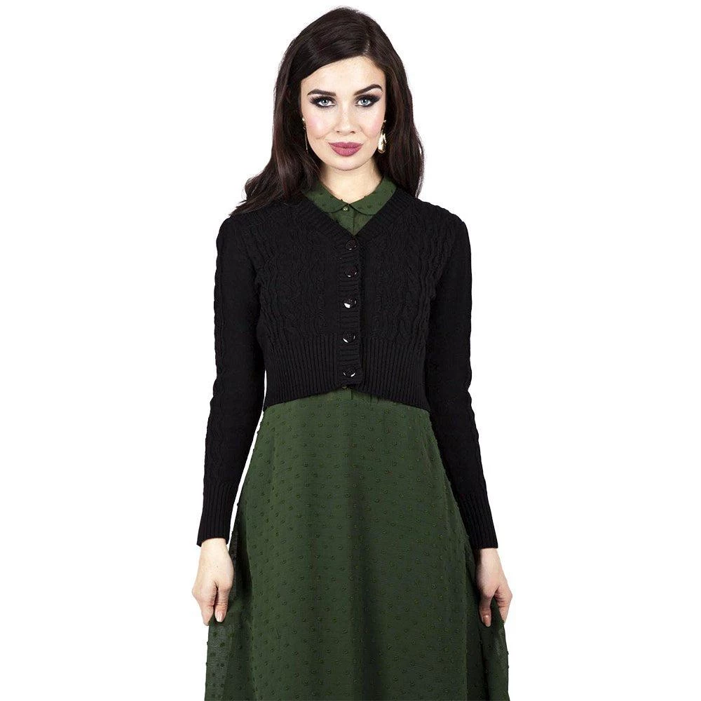 This cozy cardigan from Voodoo Vixen is fabulous 40’s at its best! The beautiful cable knit sweater has long sleeves, a v-neck, and is nipped-in at the cropped waist that’s higher in the front than in the back. Sumptuous and warm, this solid black sweater goes with jeans just as beautifully as skirts.