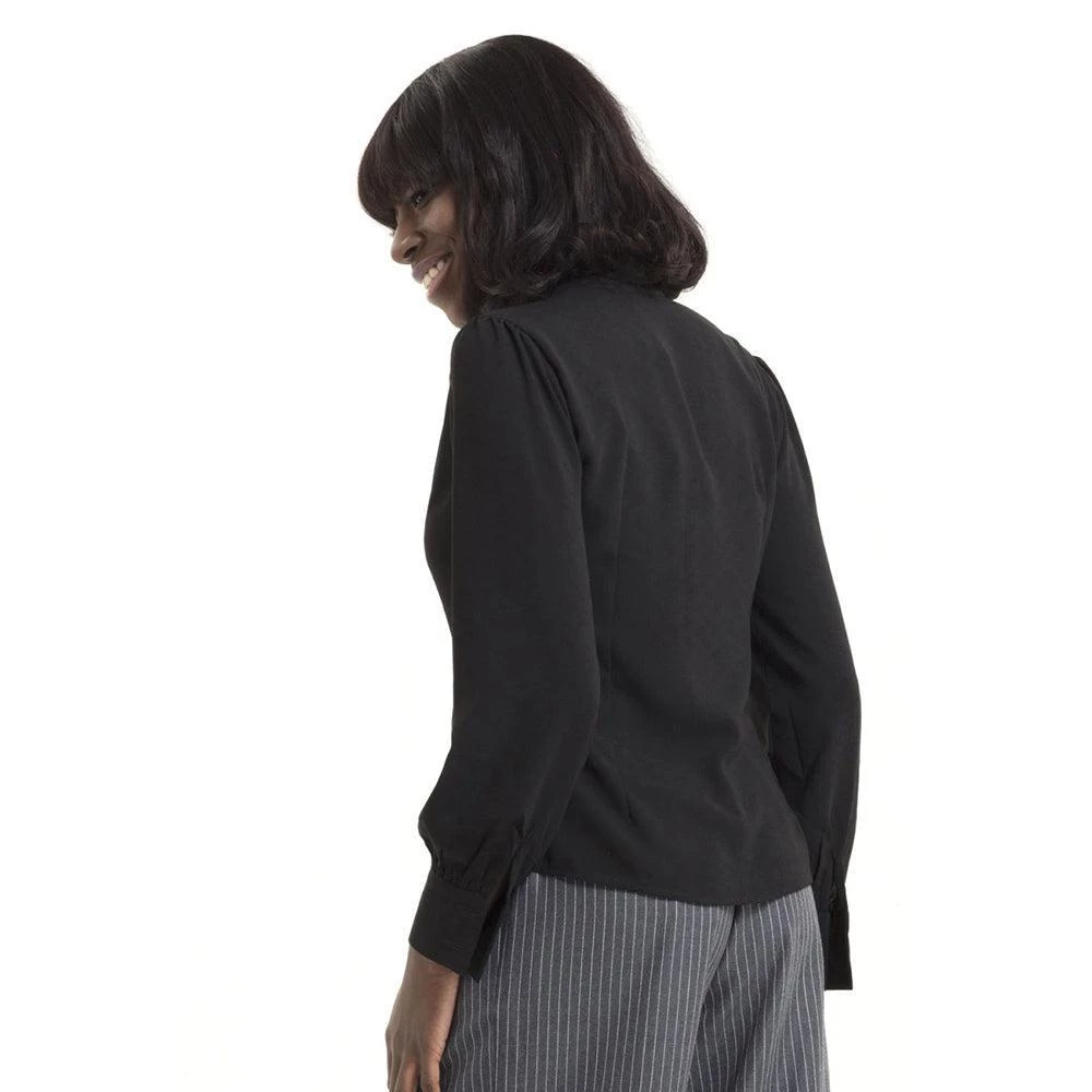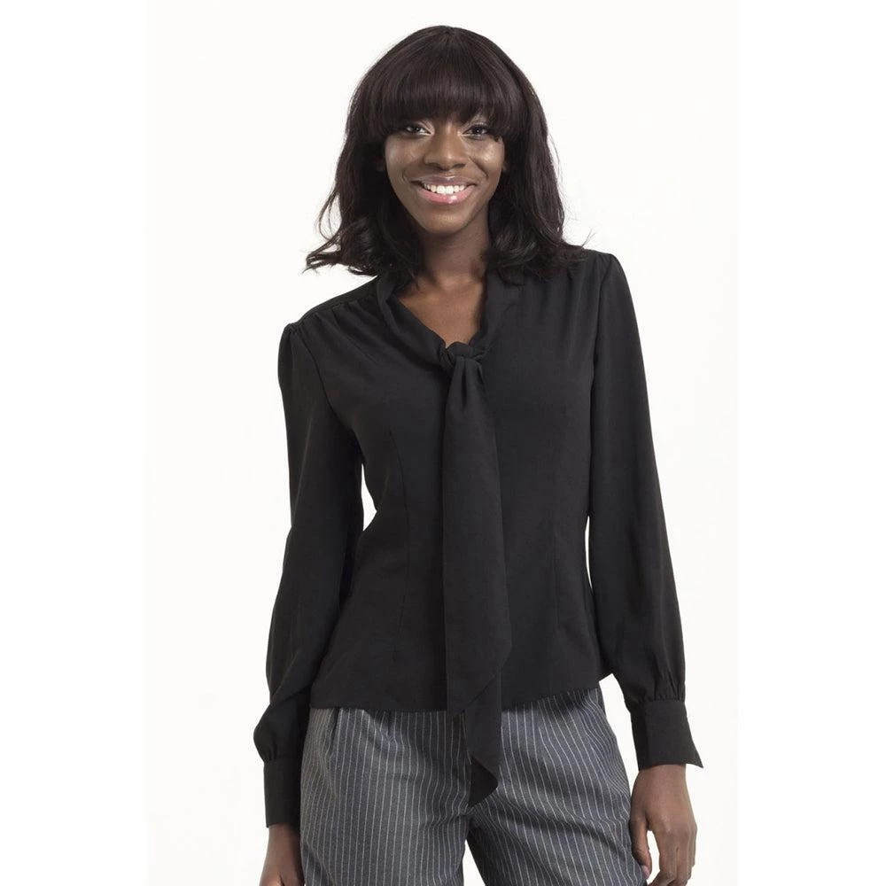 This understated staple features a tie neck, loose long sleeves with fitted cuffs, and a lovely drape. It buttons up the front with a row of fabric-covered buttons behind the generous neck tie.
