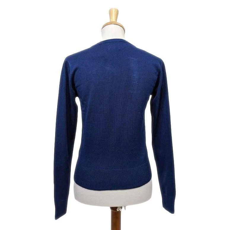 Welcome to Christma Town! This fabulous holiday cardigan features an embroidered winter scene featuring snowy trees, a skier, a fun snowman, and a bright red fox. All are on a deep navy blue background. Functional blue buttons run down the front.Â