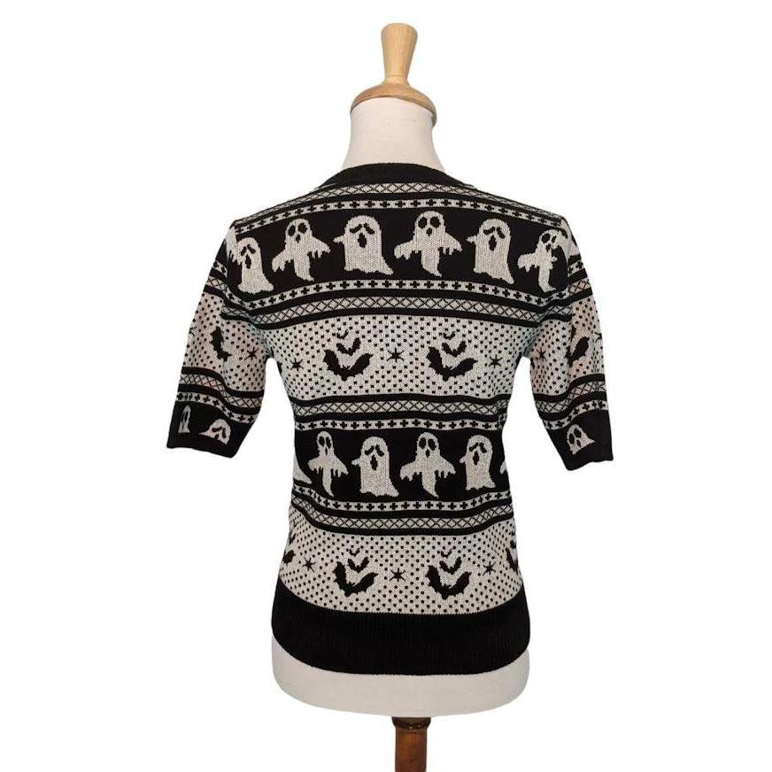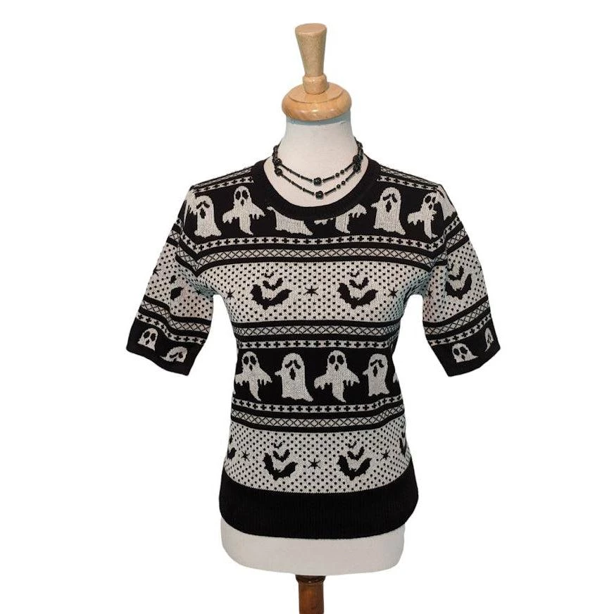 Banned brings us the best ghost stories for Halloween! This short-sleeved pullover sweater is sure to be a favorite “every day is Halloween” top! It features bats and ghosts knitted into rows of beautifully patterned black and white. The super-soft sweater has black ribbing at the collar and hem. So fun!!!