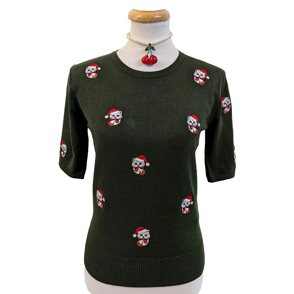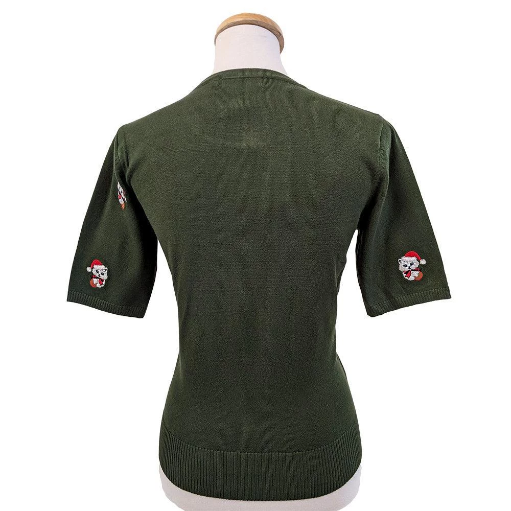 Meow-y Chwistmas! Our favorite blue-eyed santa kitten from Banned is appliqued onto a simple green knit pullover, ready for some holiday fun. Lusciously soft knit, the pullover has a round ribbed neckline and elbow-length sleeves. Pairs perfectly with plaids or prints for bringing smiles to any holiday gathering.