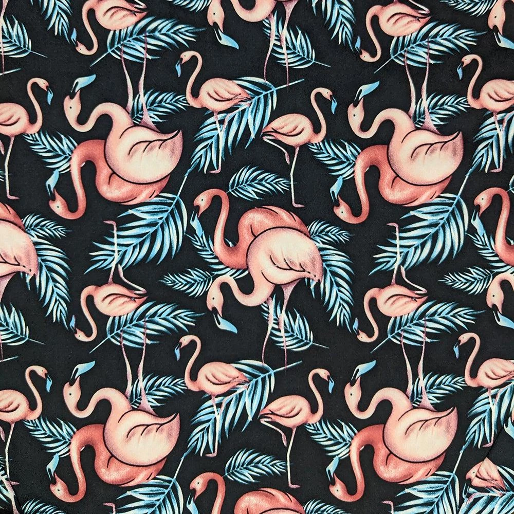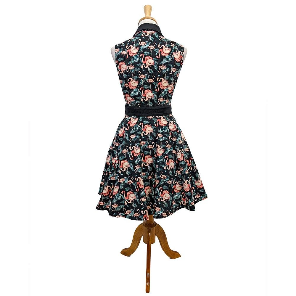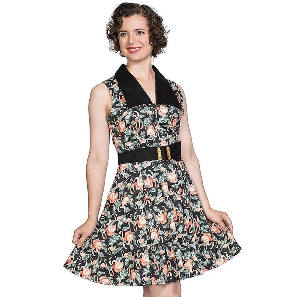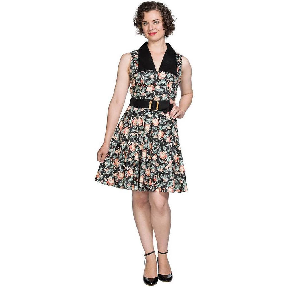 You are going to look flam-azing in this tropical flamingo dress from Banned Apparel. This sleeveless swing dress features an all-over tropical print with a constrastng black oversized collar, and included belt with bamboo-style buckle.