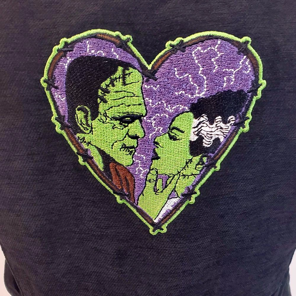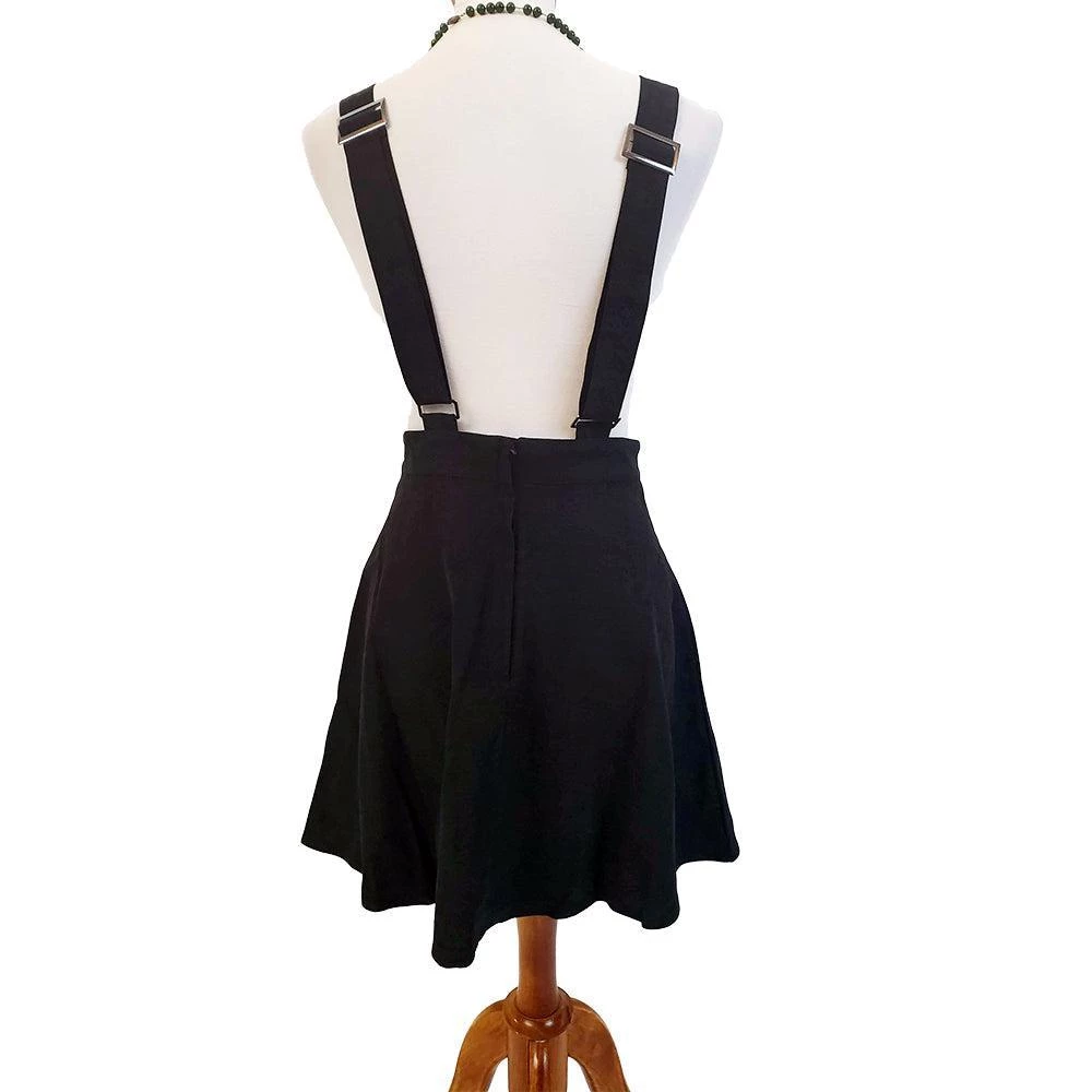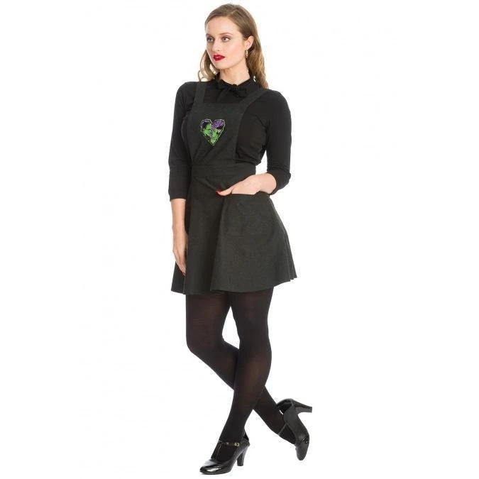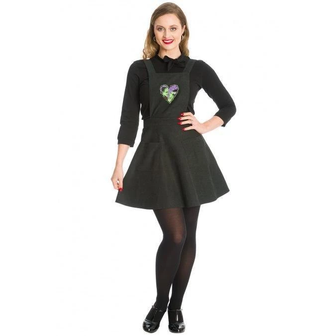 Another super cute item from Banned “made for” the bewitching season! This black pinafore features their signature Frankenstein and Bride patch on the front bib. It has adjustable straps and the short swing skirt zips up the back. Blouse not included.